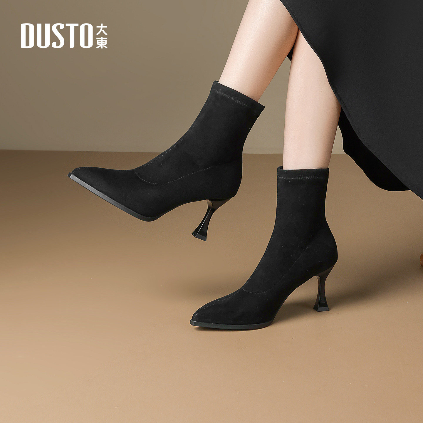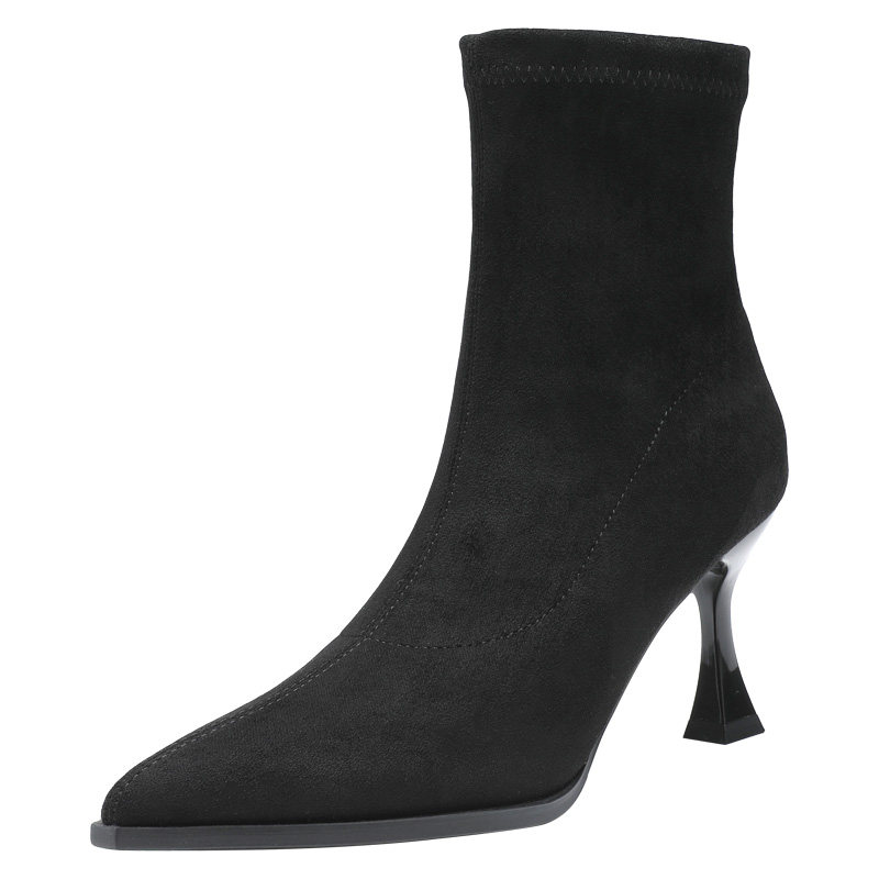 大东尖头高跟短靴女2025新款秋冬弹力瘦瘦靴绒面磨砂黑色靴子袜靴
