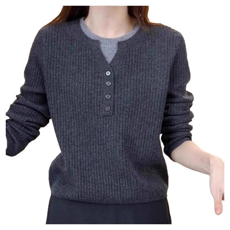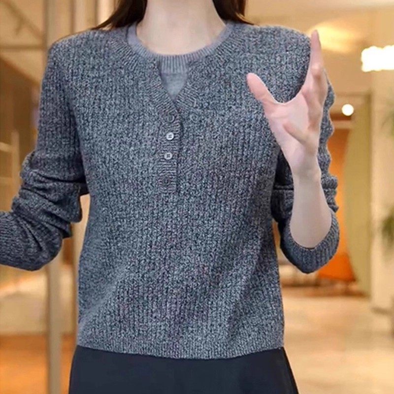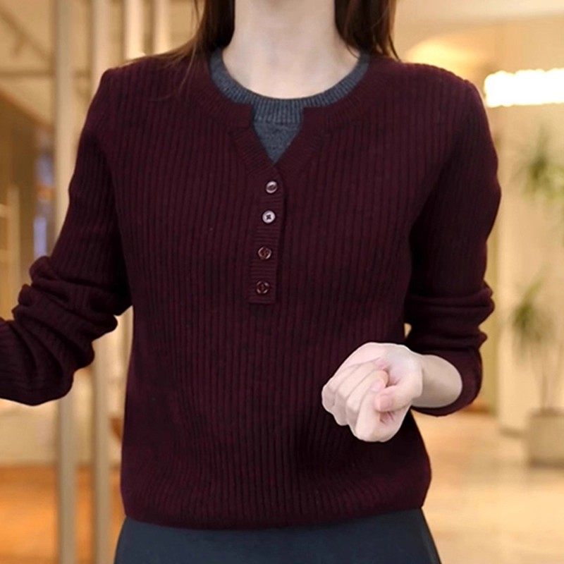 2025新款秋冬毛衣女圆领假两件打底衫套头修身短款针织衫内搭上衣