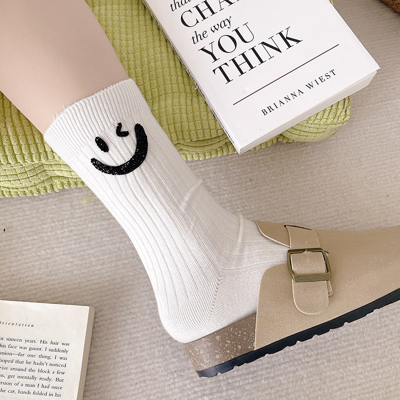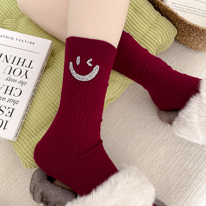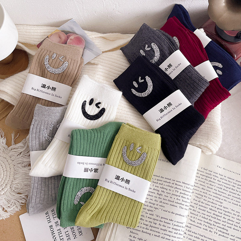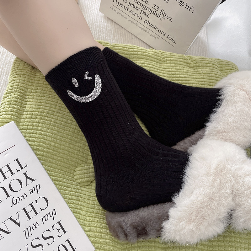 笑脸水钻袜子女中筒袜ins潮流网红款外穿搭配老爹鞋洋气欧货秋冬