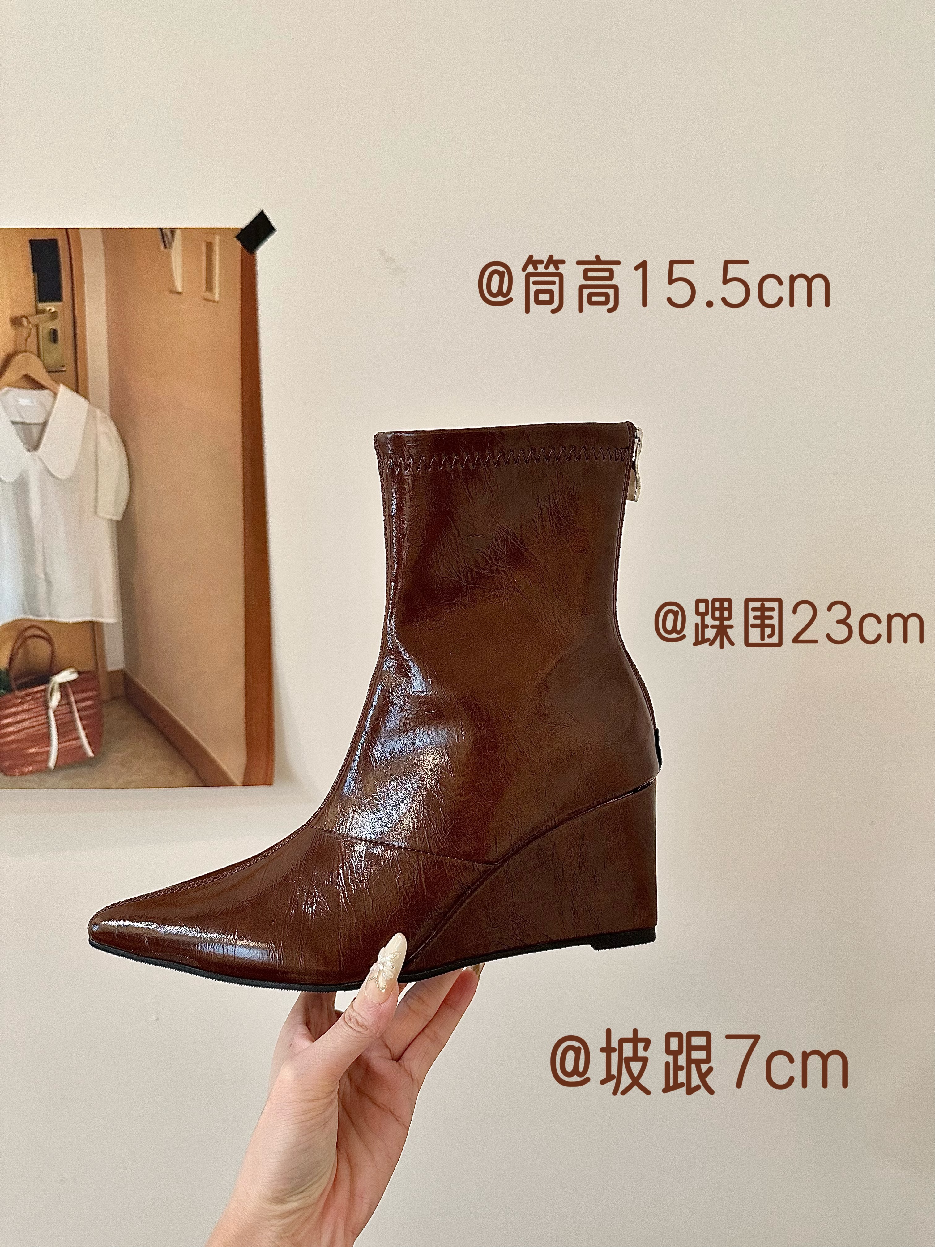 titing好高级!时髦漆皮尖头坡跟瘦瘦靴女秋韩版通勤漏了高跟短靴