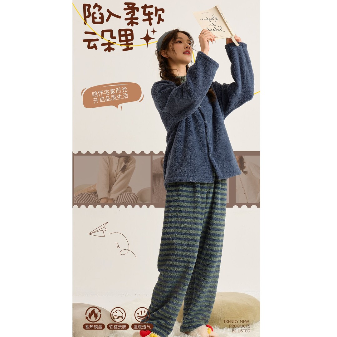 末帖/MOTIE新款糯米绒冬季睡衣糯糯套装保暖加绒加厚条纹家居服女