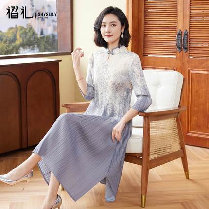 三宅褶皱新中式洋气妈妈连衣裙春季新款减龄国风旗袍盘扣长裙大码