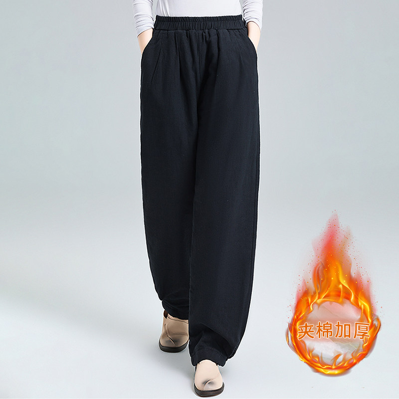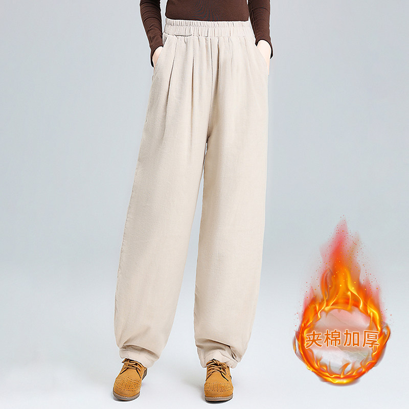 亚麻保暖棉裤女冬2025新款外穿夹棉加厚棉麻高腰萝卜裤宽松灯笼裤