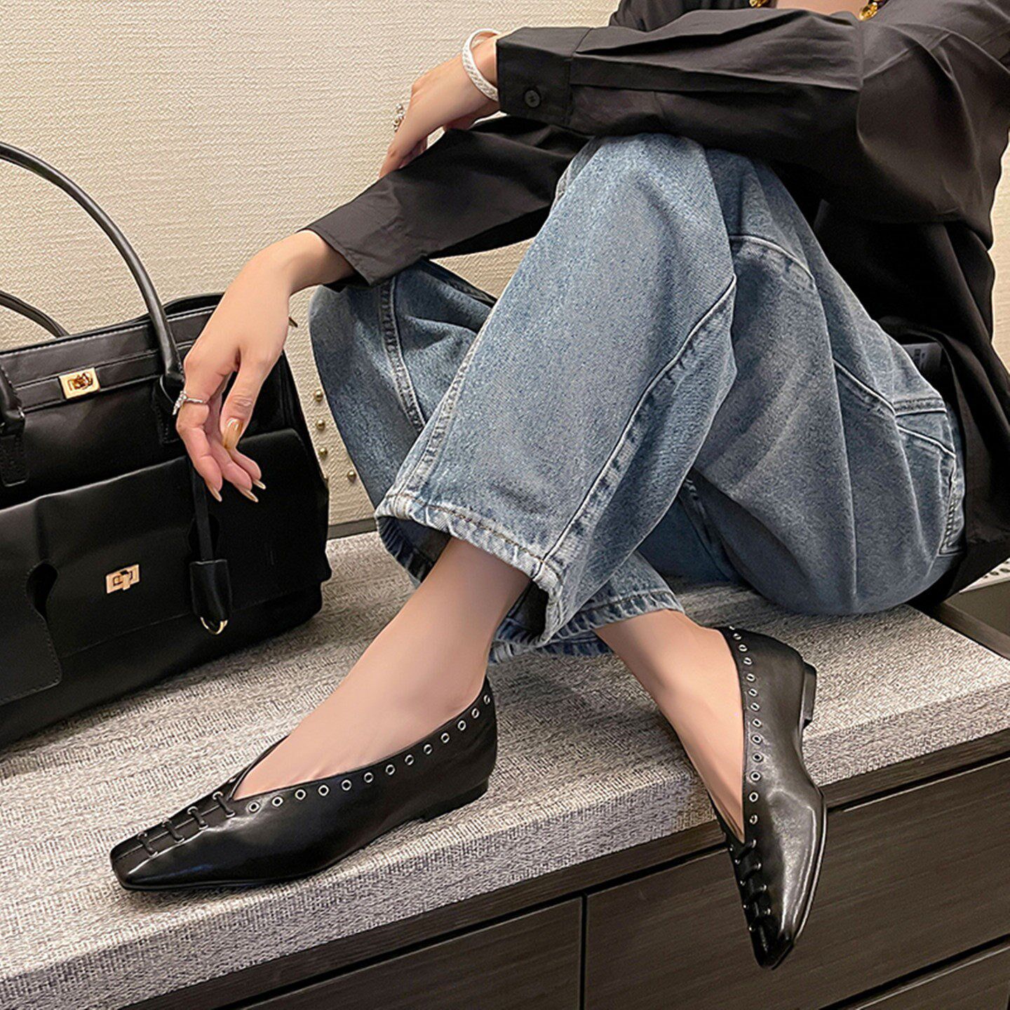 真皮法式气质方头浅口小众铆钉老钱风通勤百搭黑色单鞋女2026新款