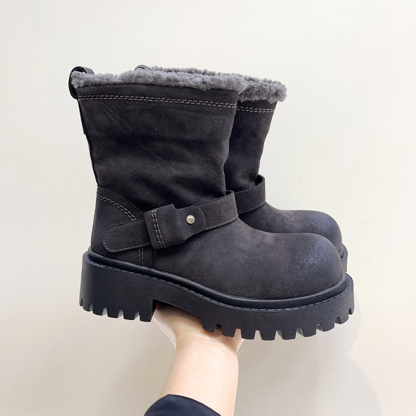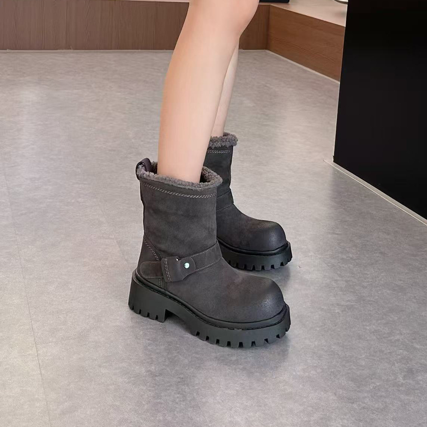 2025冬季新款复古皮带扣磨砂皮加绒马丁靴女粗跟厚底套筒机车短靴