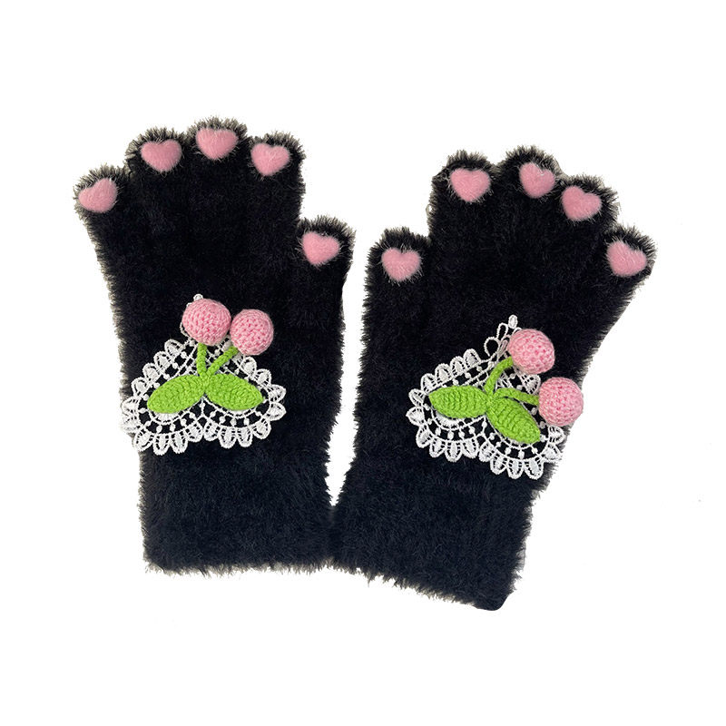 袜贵人冬季甜系爱心猫爪蕾丝樱桃獭兔毛可爱少女保暖五指手套女
