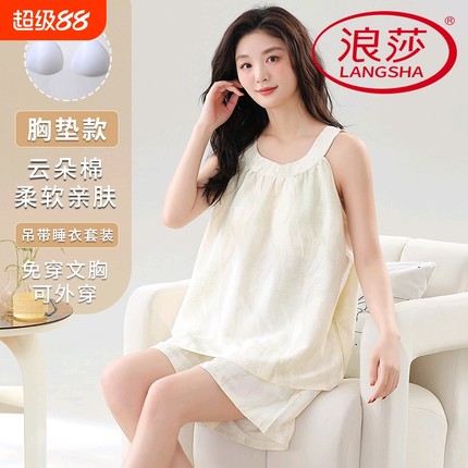浪莎夏季带胸垫睡衣女纯棉无袖吊带短裤韩范家居服两件套2025新款