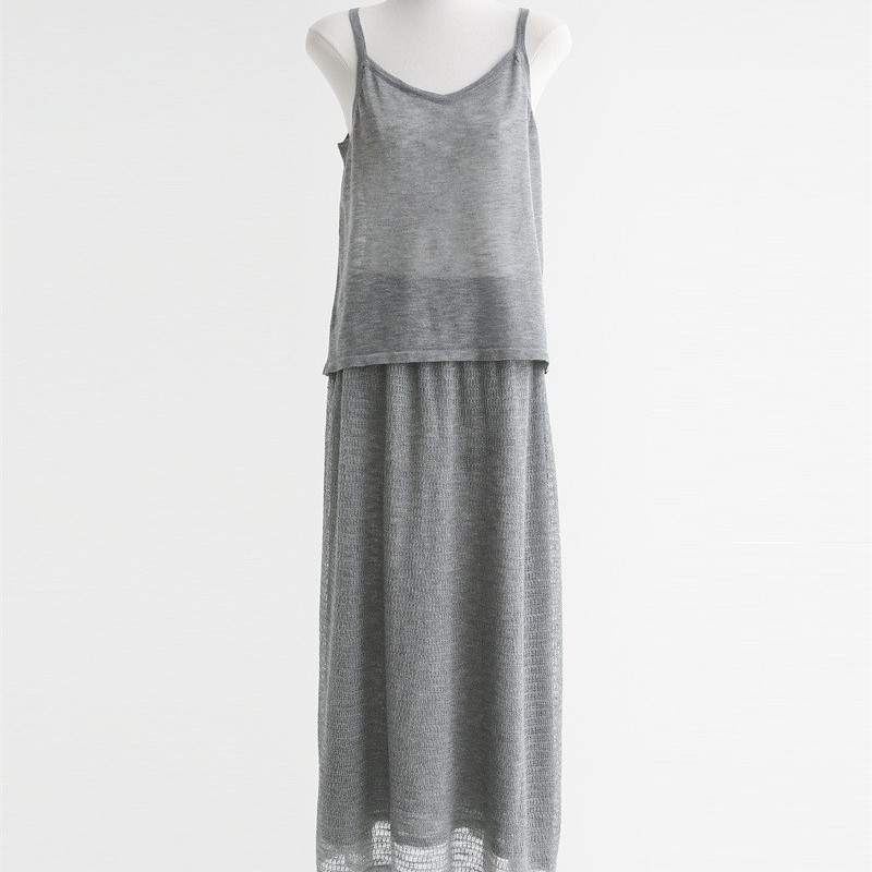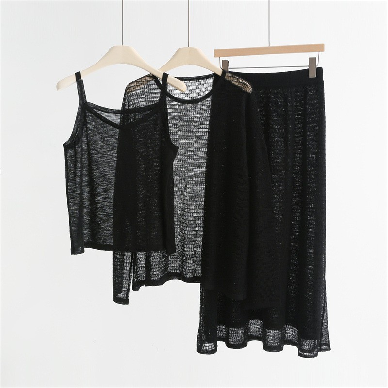 外贸原单夏三件套 超薄亚麻针织吊带+宽松镂空罩衫+双层A字半身裙