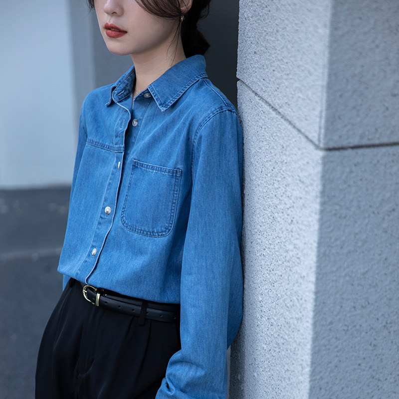 实拍牛仔衬衫女春秋新款设计感小众外套显瘦复古叠穿法式衬衣长袖
