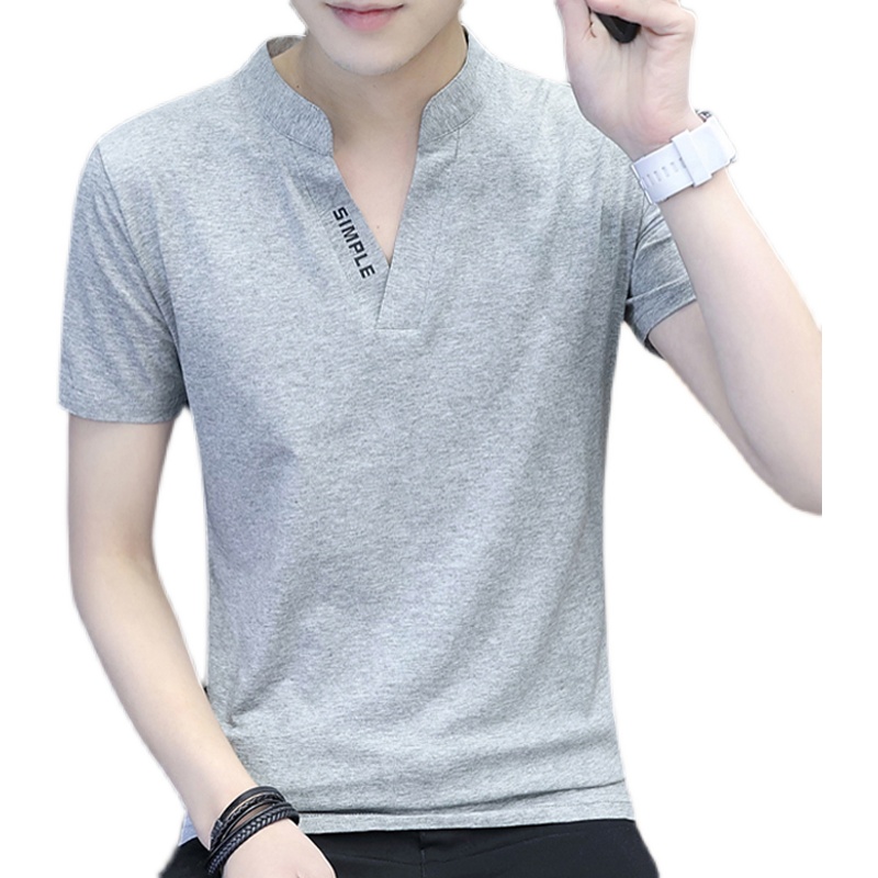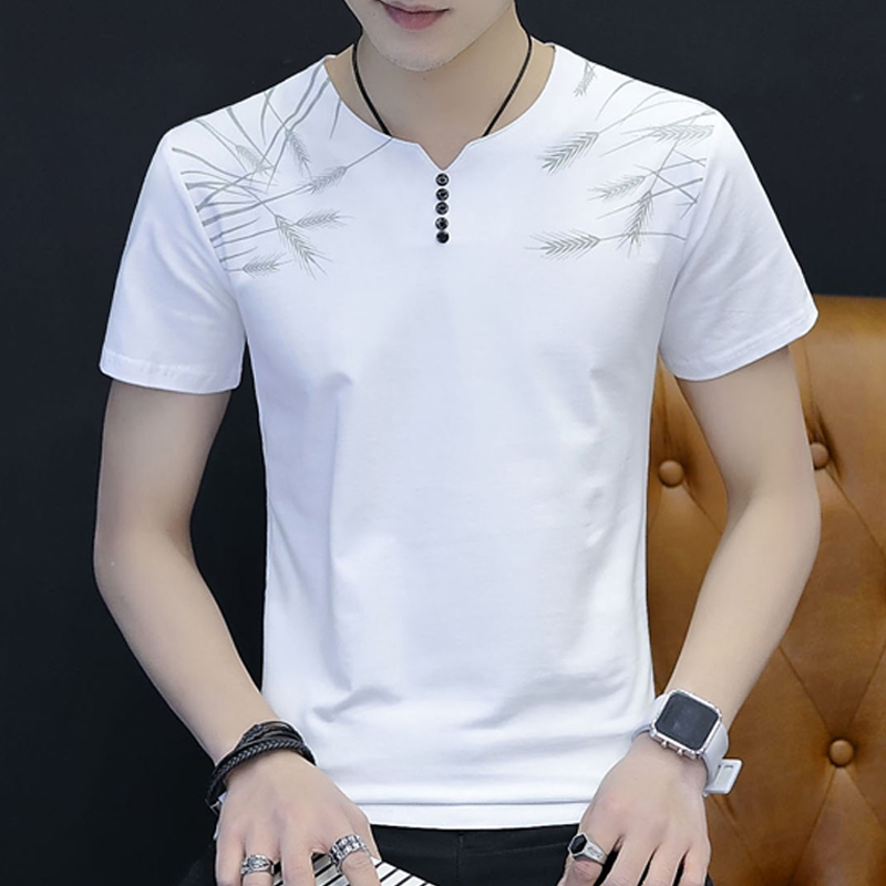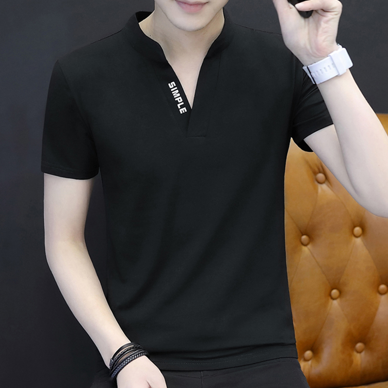 夏季短袖t恤男纯棉有领白色简约上衣男装v领修身韩版潮流半袖衣服