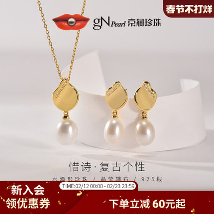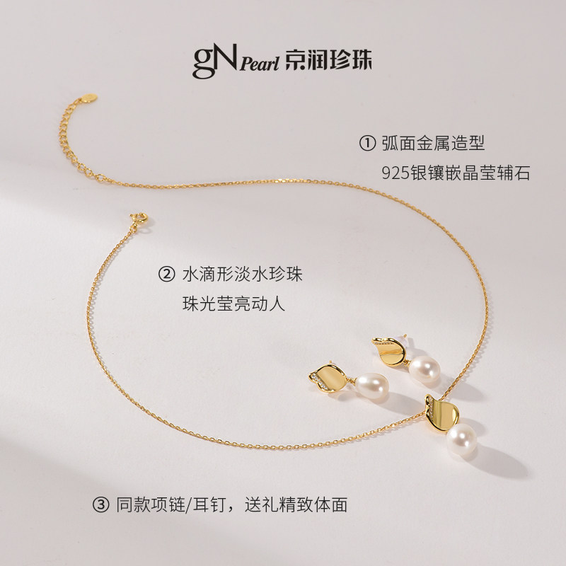 京润珍珠惜诗套装925银淡水珍珠项链耳钉8-10mm水滴形吊坠珠宝女D