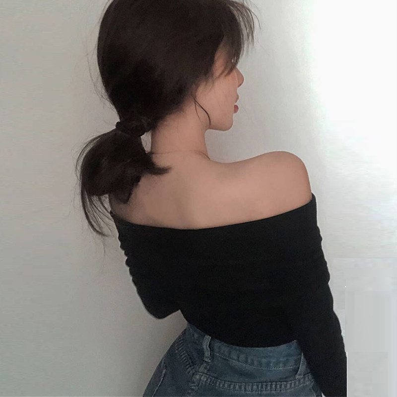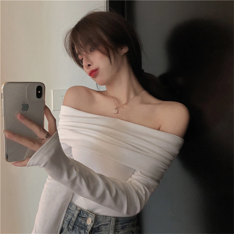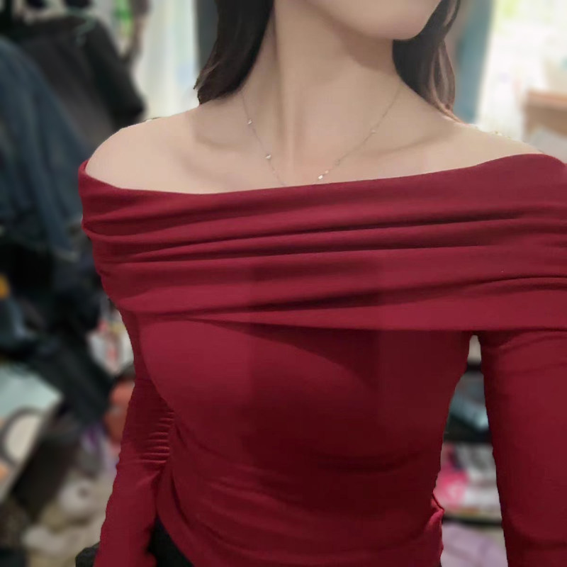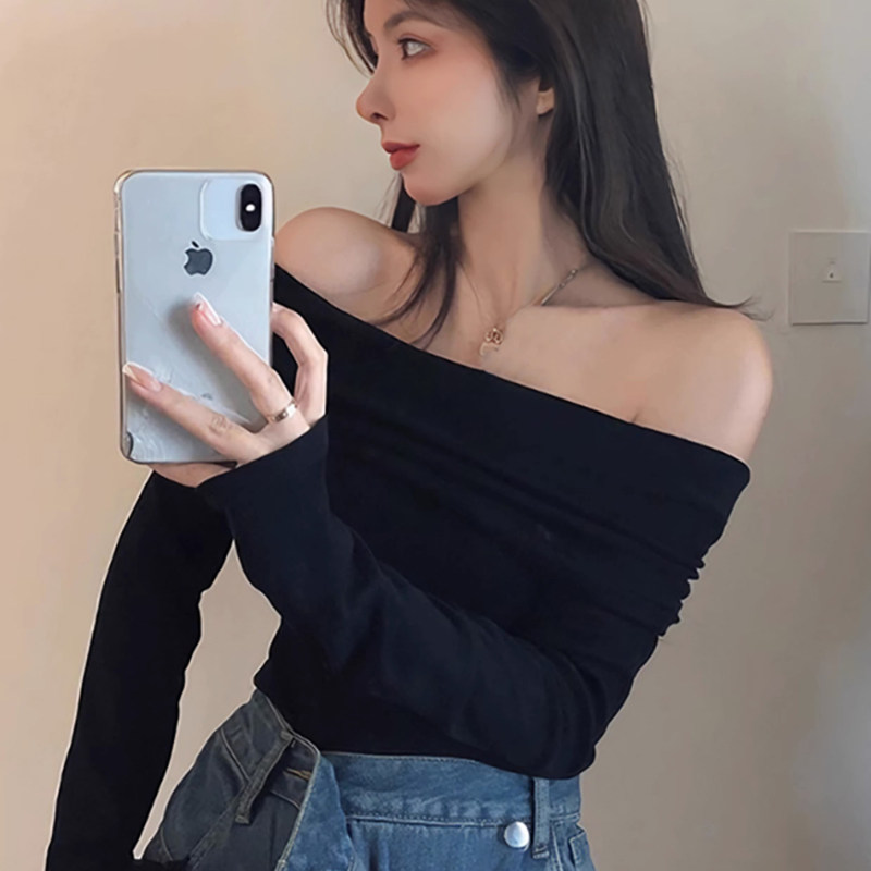 美式复古辣妹设计感一字肩长袖t恤女露肩绝美别致性感紧身打底衫