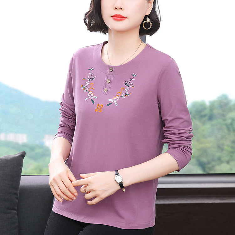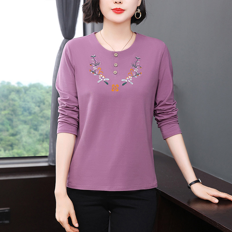 中老年时尚女装50多岁妈妈洋气上衣秋装纯棉长袖t恤女刺绣打底衫