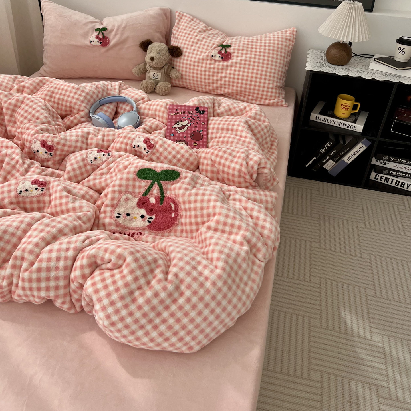 少女粉格子樱桃猫咪牛奶绒四件套