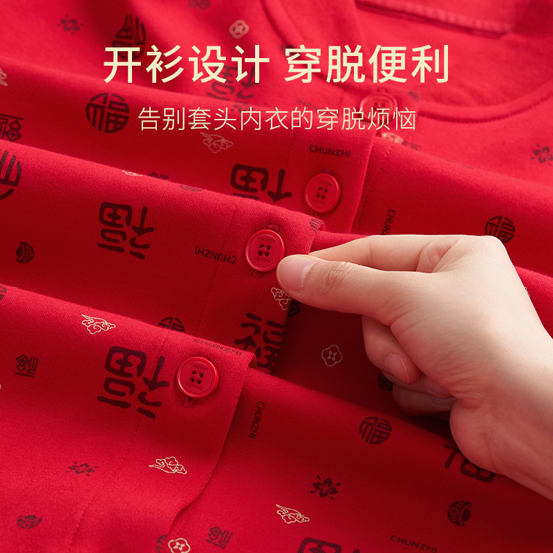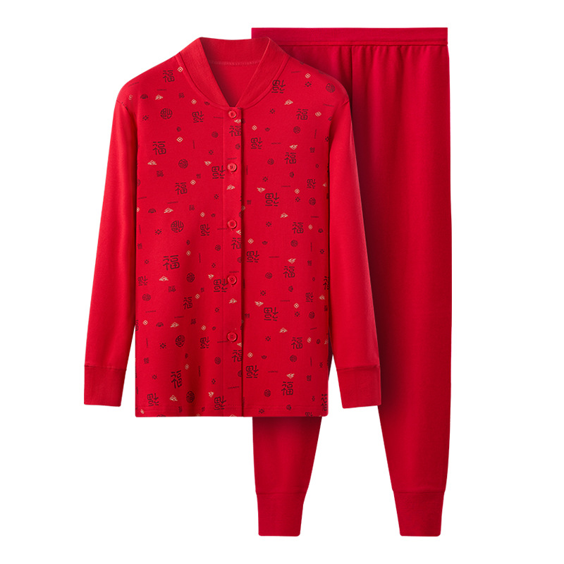 本命年大红色妈妈爸爸开衫秋衣秋裤套装男女纯棉中老年保暖内衣薄