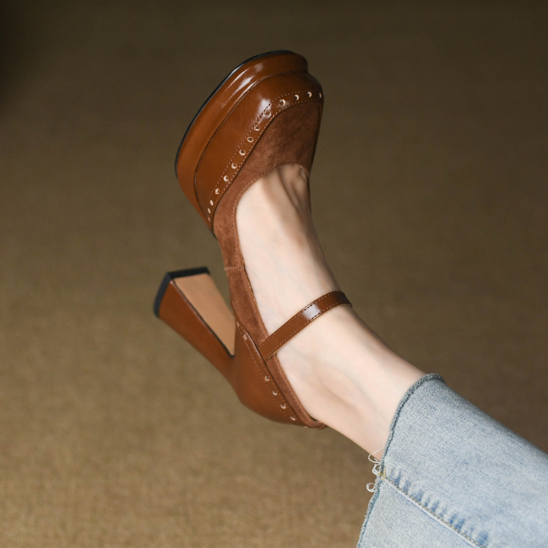 9.8cm拼接黑色高跟鞋女春秋款磨砂羊皮真皮防水台粗跟浅口单鞋女