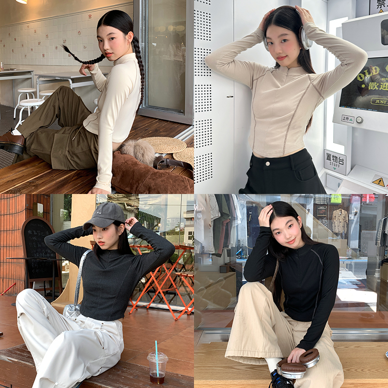 KHV真维斯撞色薄绒打底衫女秋冬2025新款半高领收腰长袖内搭上衣