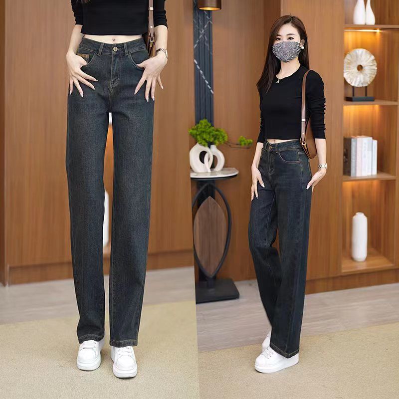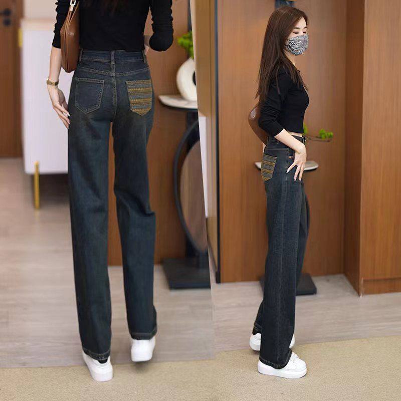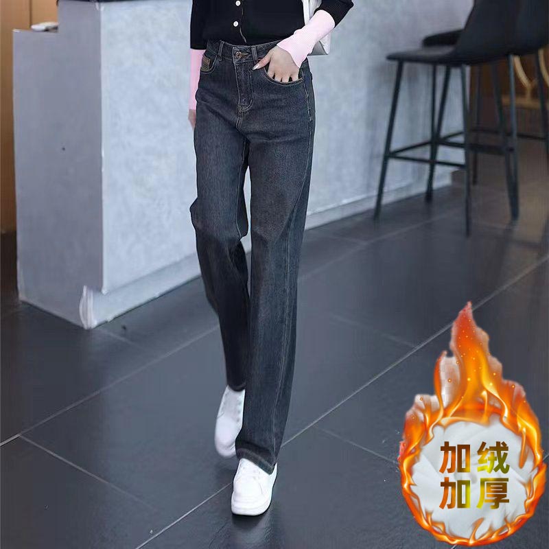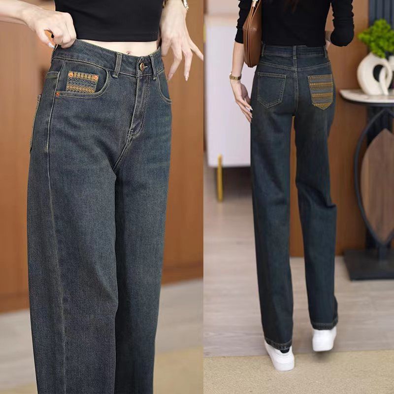 秋冬加绒直筒牛仔裤女士2025新款刺绣显高腰显瘦宽松窄版阔腿裤子
