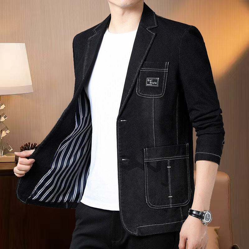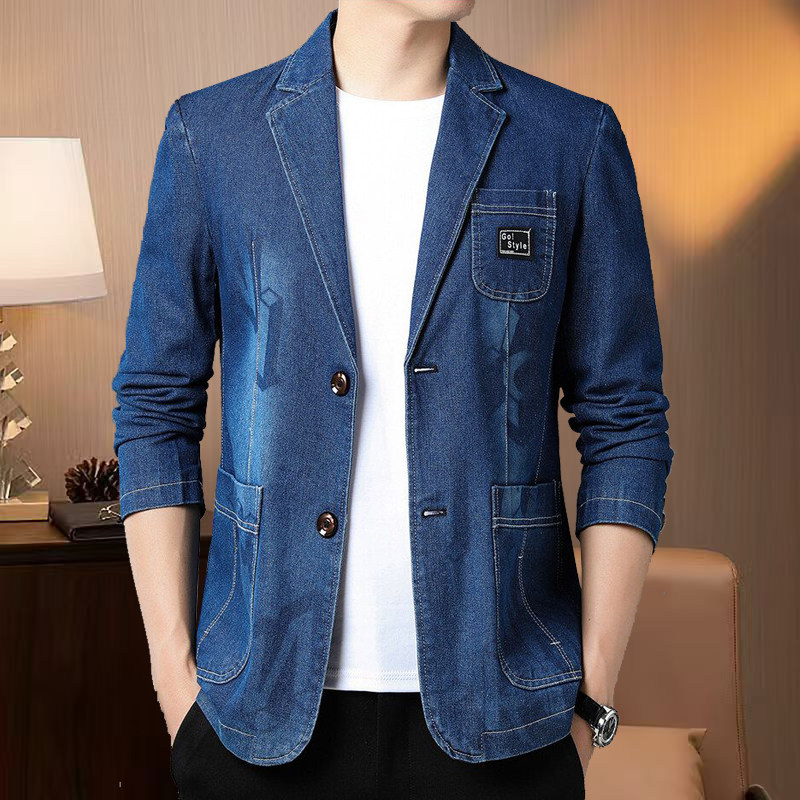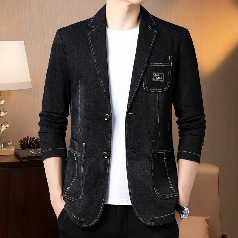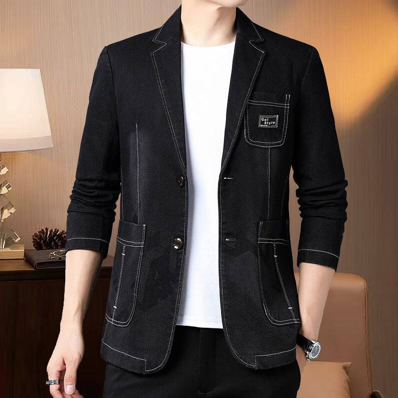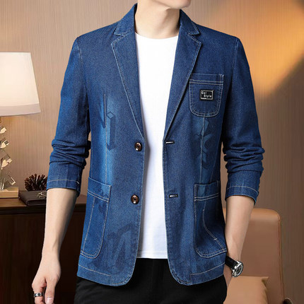 新款修身棉质牛仔西装外套潮牌休闲男士商务夹克别致休闲印花西服