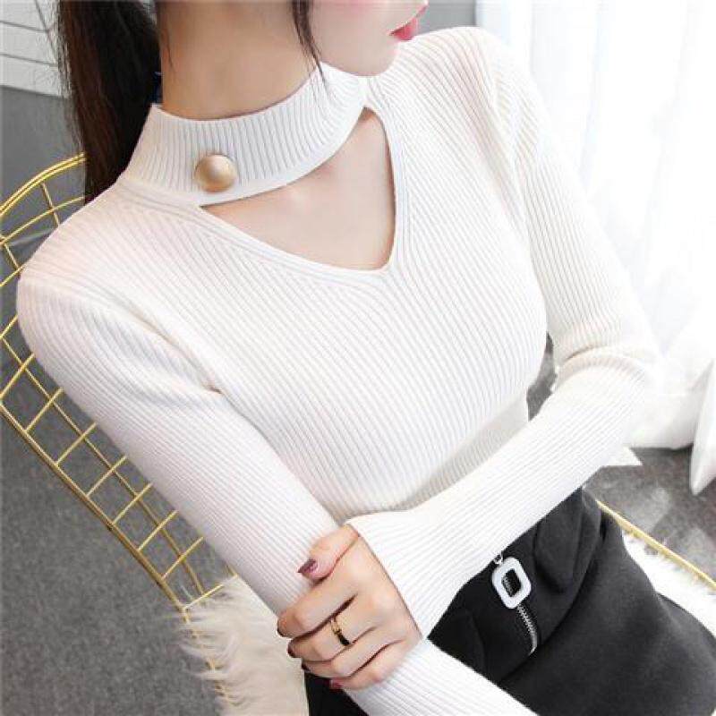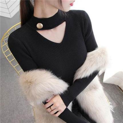 黑色半高领镂空挂脖针织衫女长袖春秋新款修身内搭毛衣高级感上衣