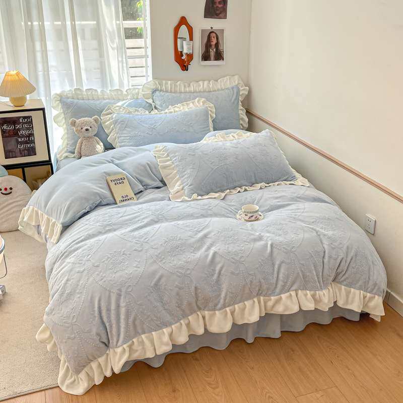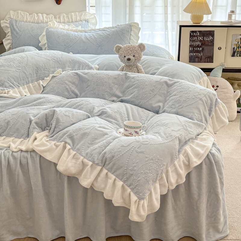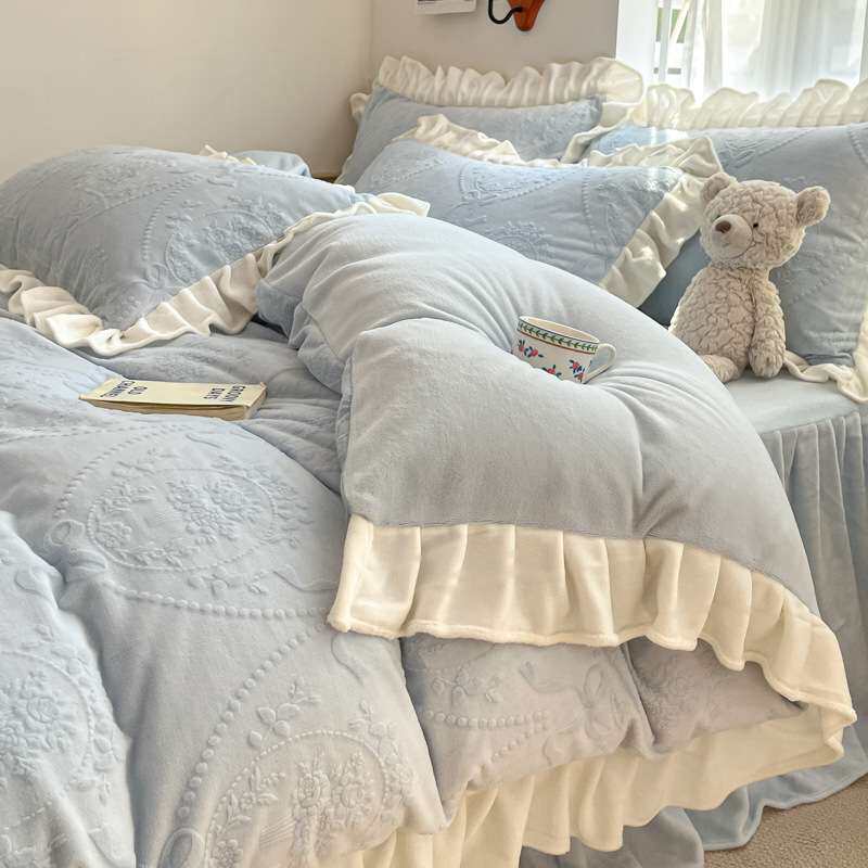 秋冬季公主风雕花牛奶绒床上四件套珊瑚绒床品双面绒被套加绒床单