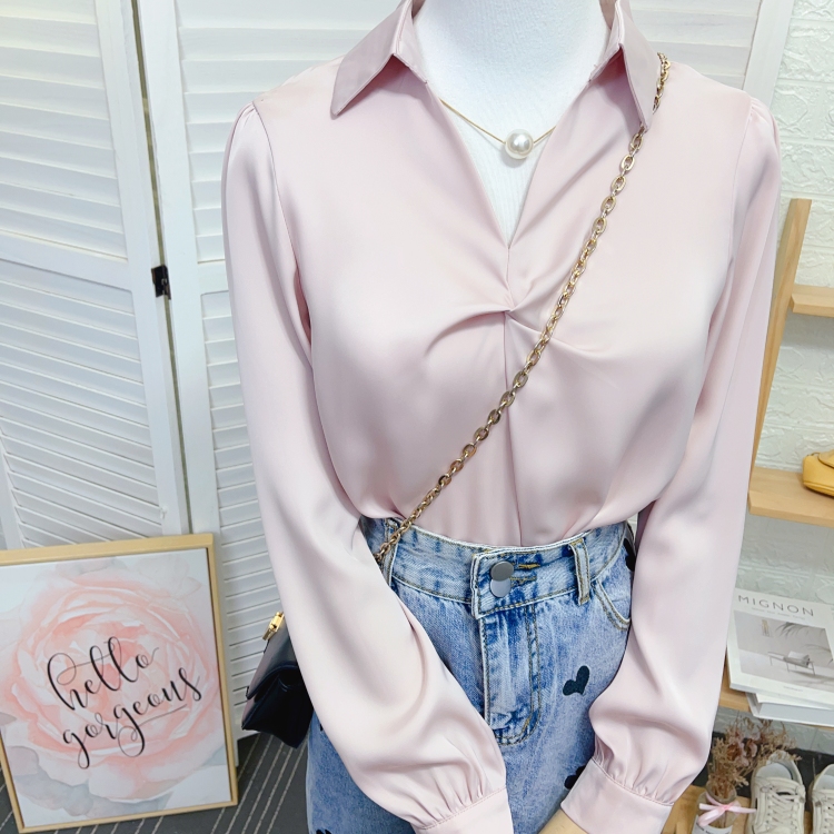 项链V领宽松长袖醋酸缎面衬衫