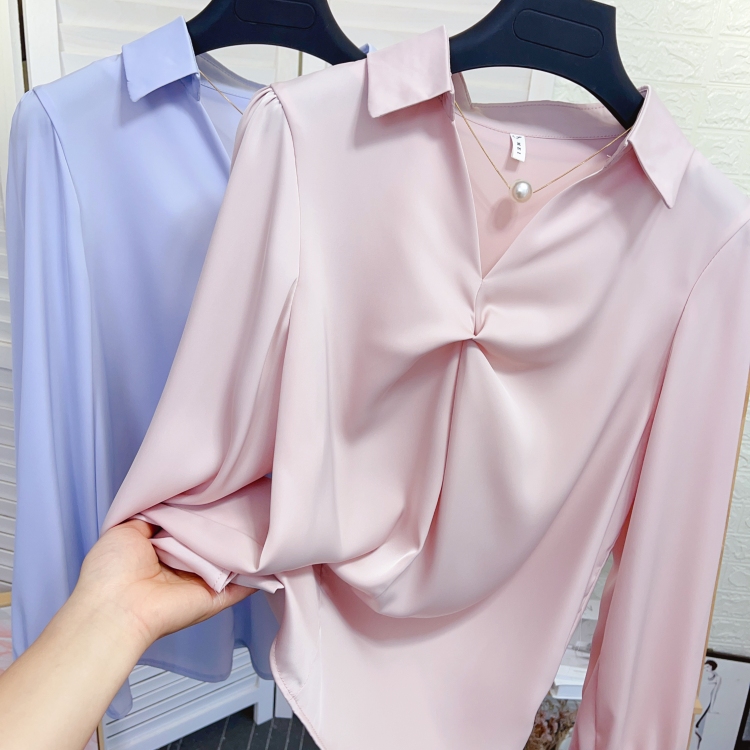 设计感项链V领醋酸缎面长袖衬衫女春秋气质职业真丝打底衬衣上衣
