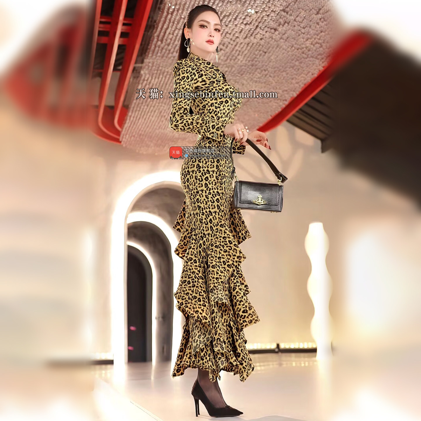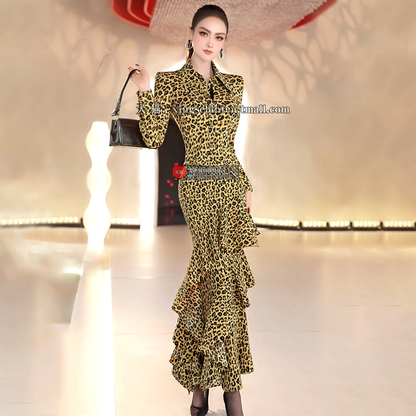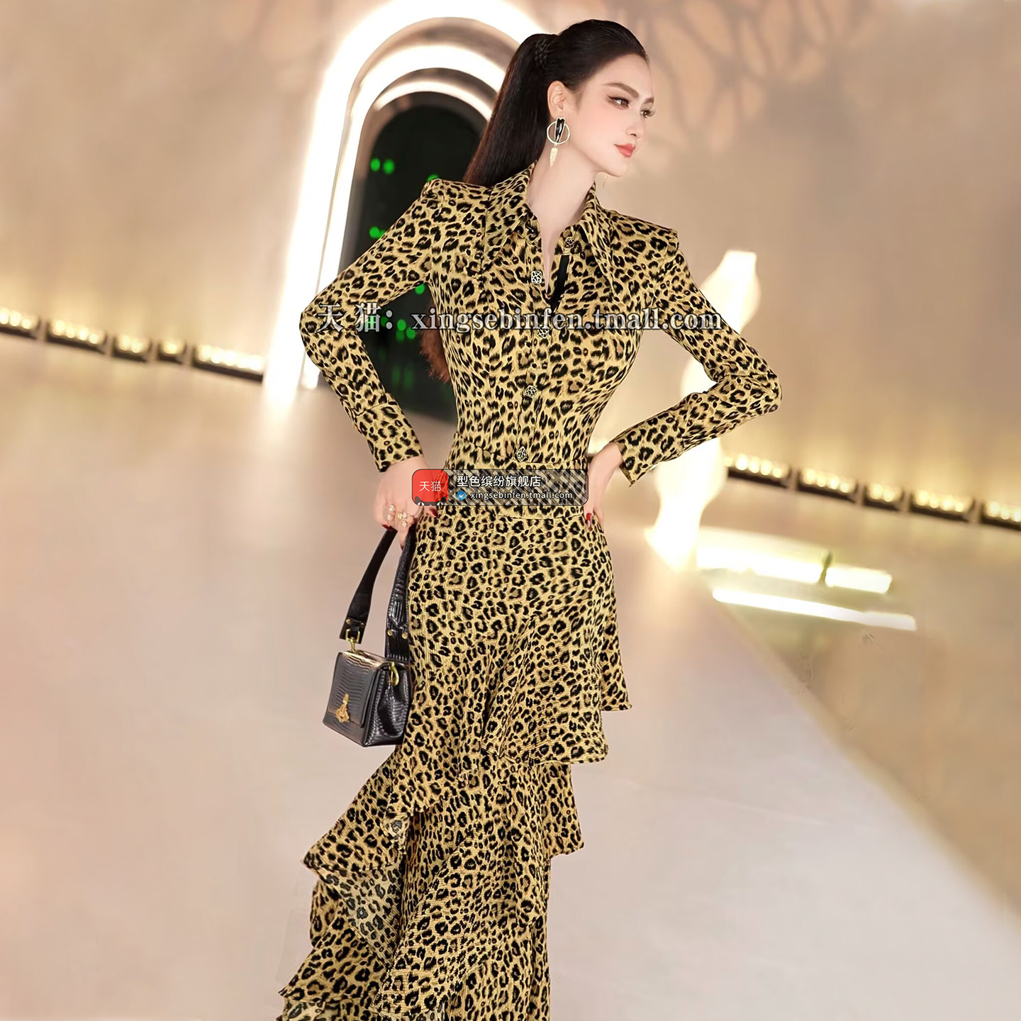初秋豹纹印花衬衫不规则荷叶边鱼尾裙两件套2025新款女人味套装裙