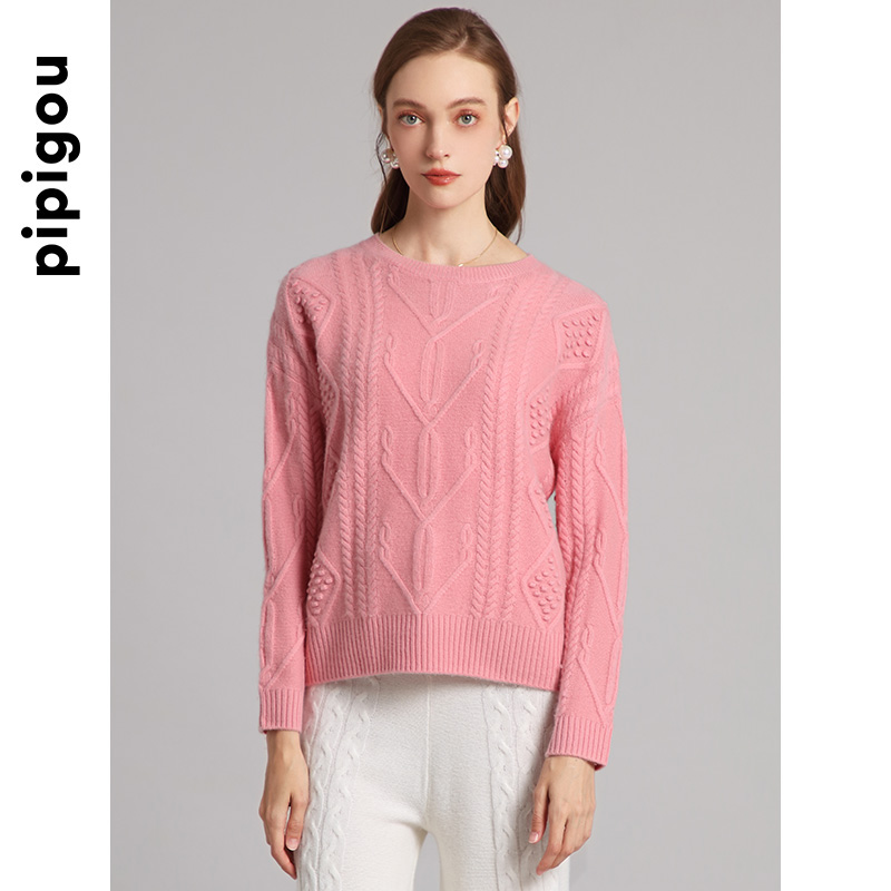 皮皮狗秋冬新款圆领粗针绞花加厚款女士羊绒衫针织套头衫
