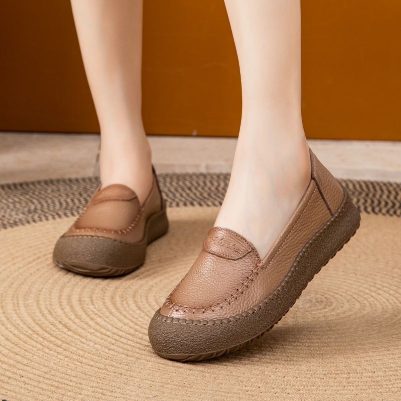 头层牛皮缝线真皮妈妈鞋女春季软底软面单鞋女中老年休闲小皮鞋女
