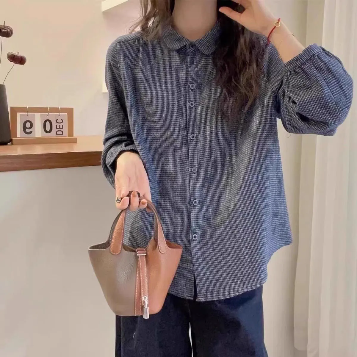 深蓝色翻领格子长袖衬衣衬衫女2025新款早秋季巨好看设计感上衣