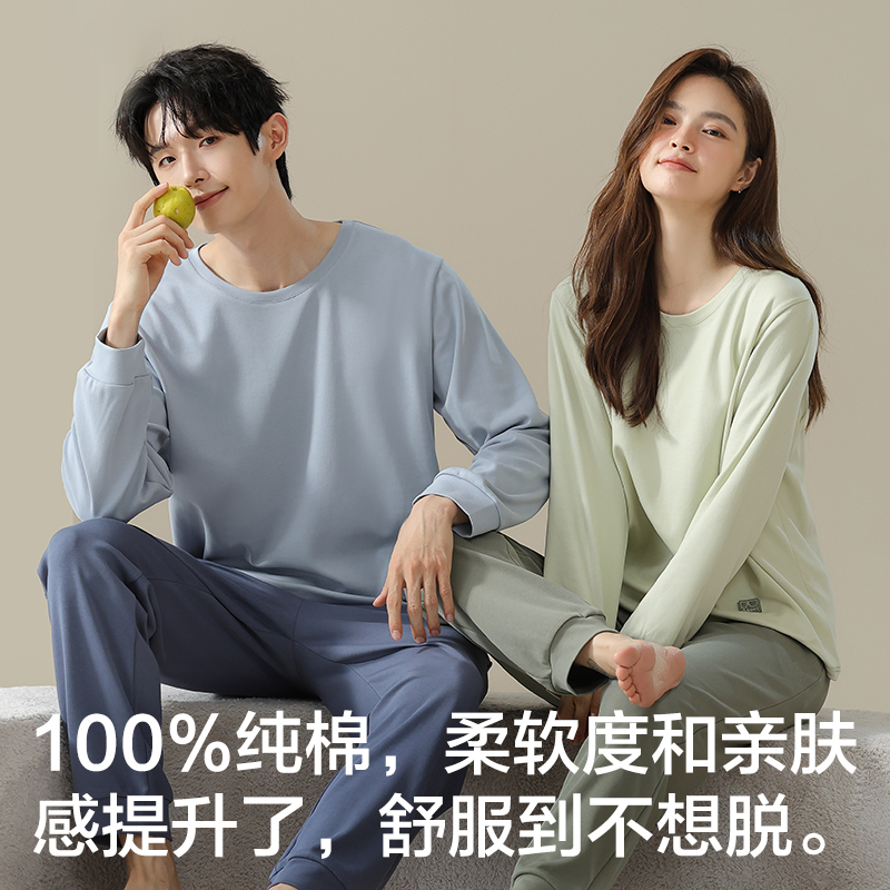恒源祥纯棉情侣睡衣男女秋冬季款纯色套头长袖套装可外穿全棉宽松