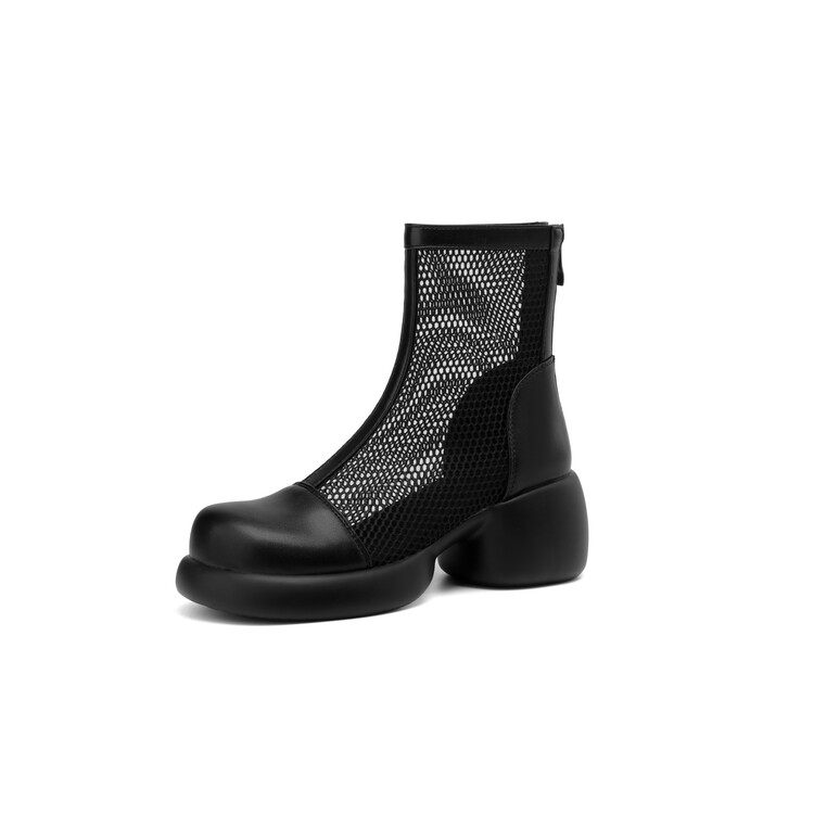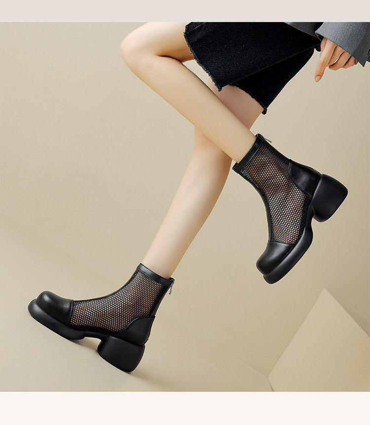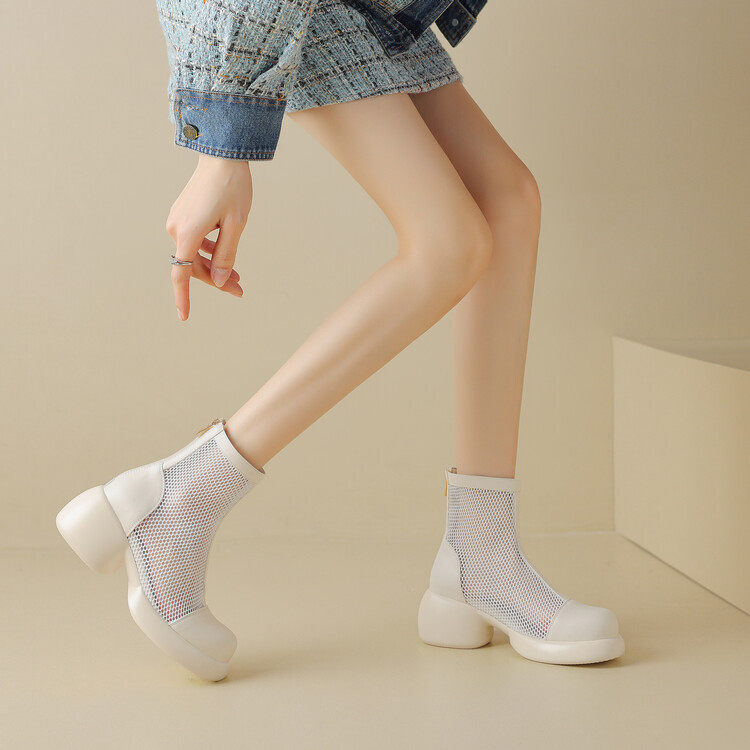 镂空网靴粗跟高跟短靴女米白色靴子春秋夏凉靴夏靴大码女靴 JMYR