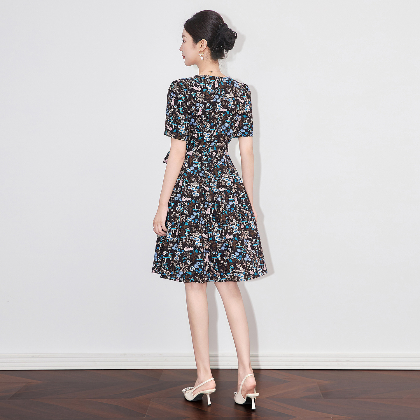 2025夏季新款女装气质高端复古优雅印花连衣裙短袖收腰显瘦a字裙