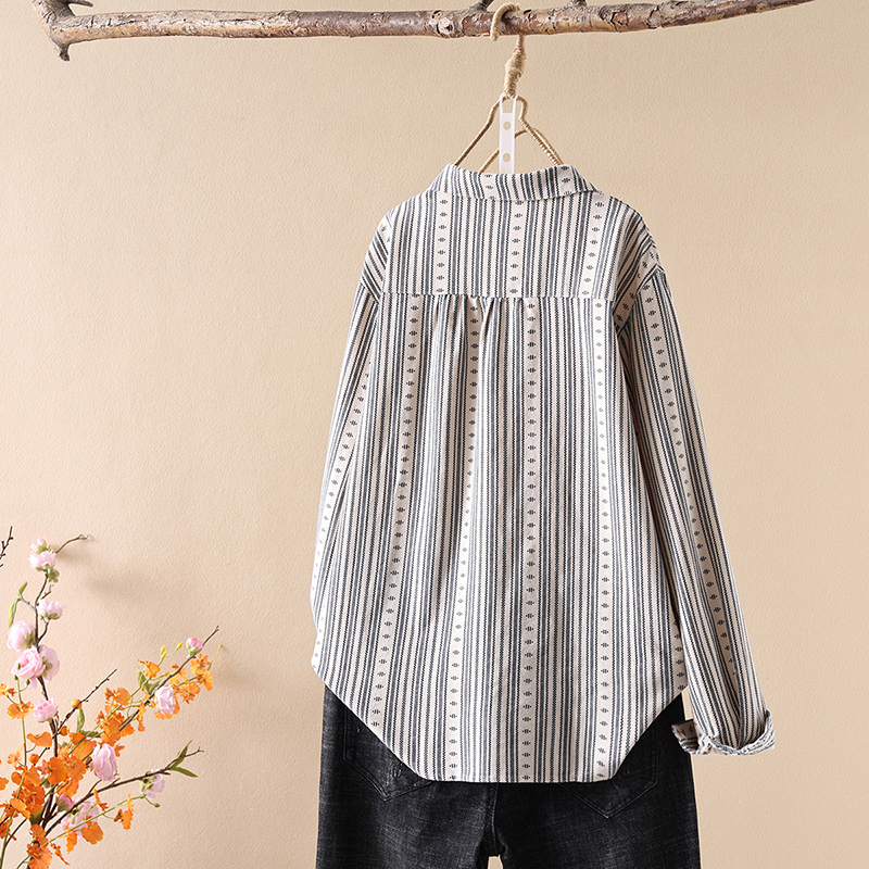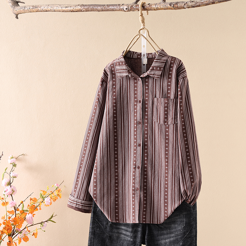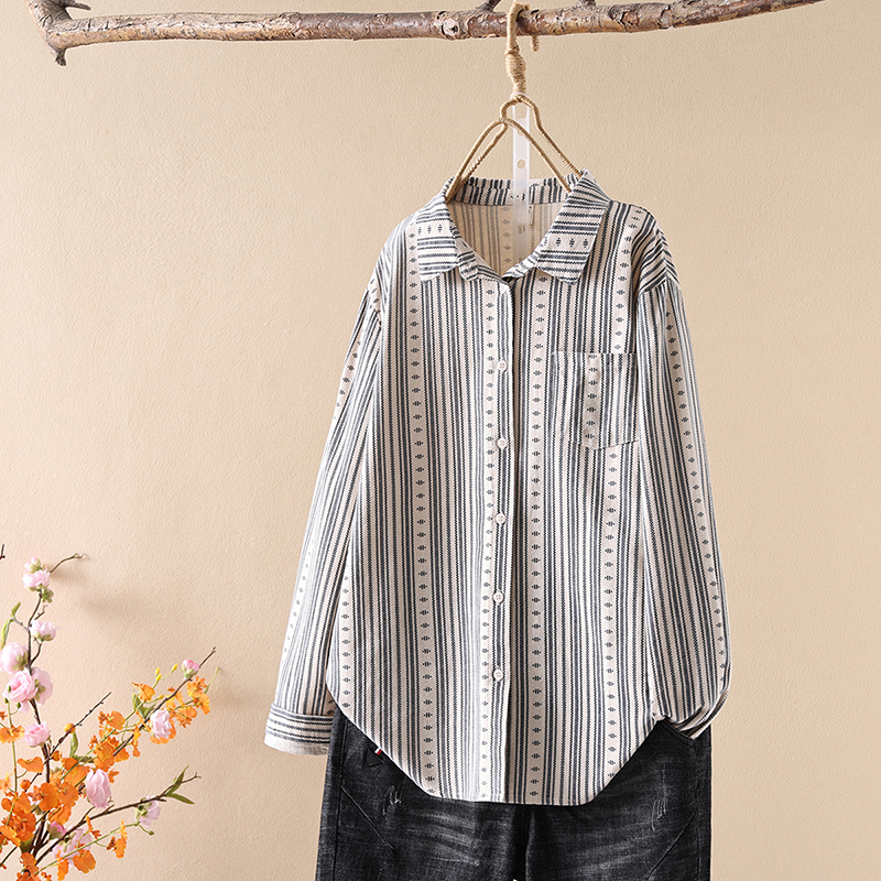 复古印花磨毛长袖衬衫女春秋季新款宽松显瘦纯棉文艺衬衣休闲上衣
