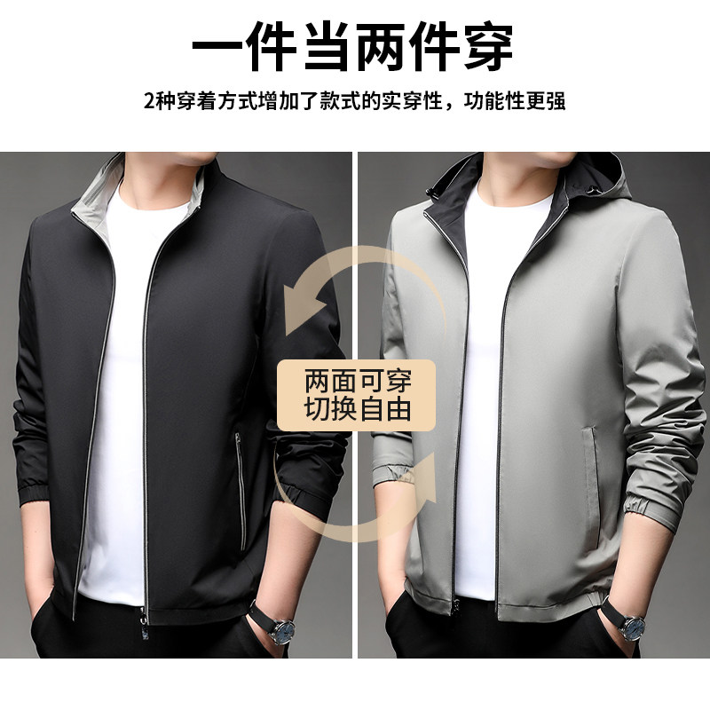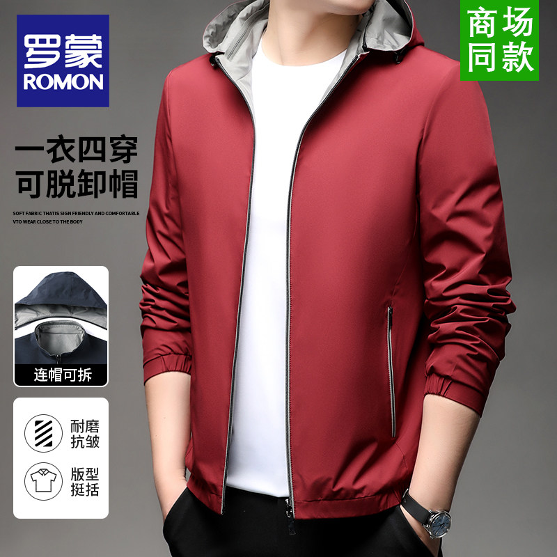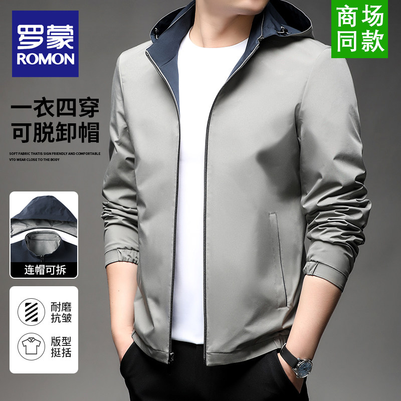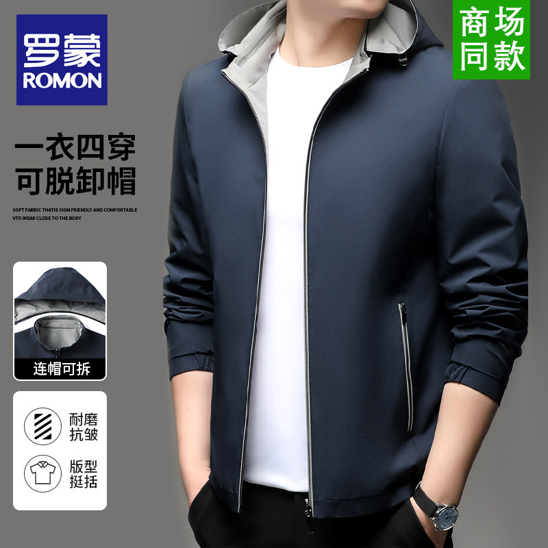 罗蒙春秋五防双面穿新款男士夹克外套连帽可脱卸商务休闲行政上衣