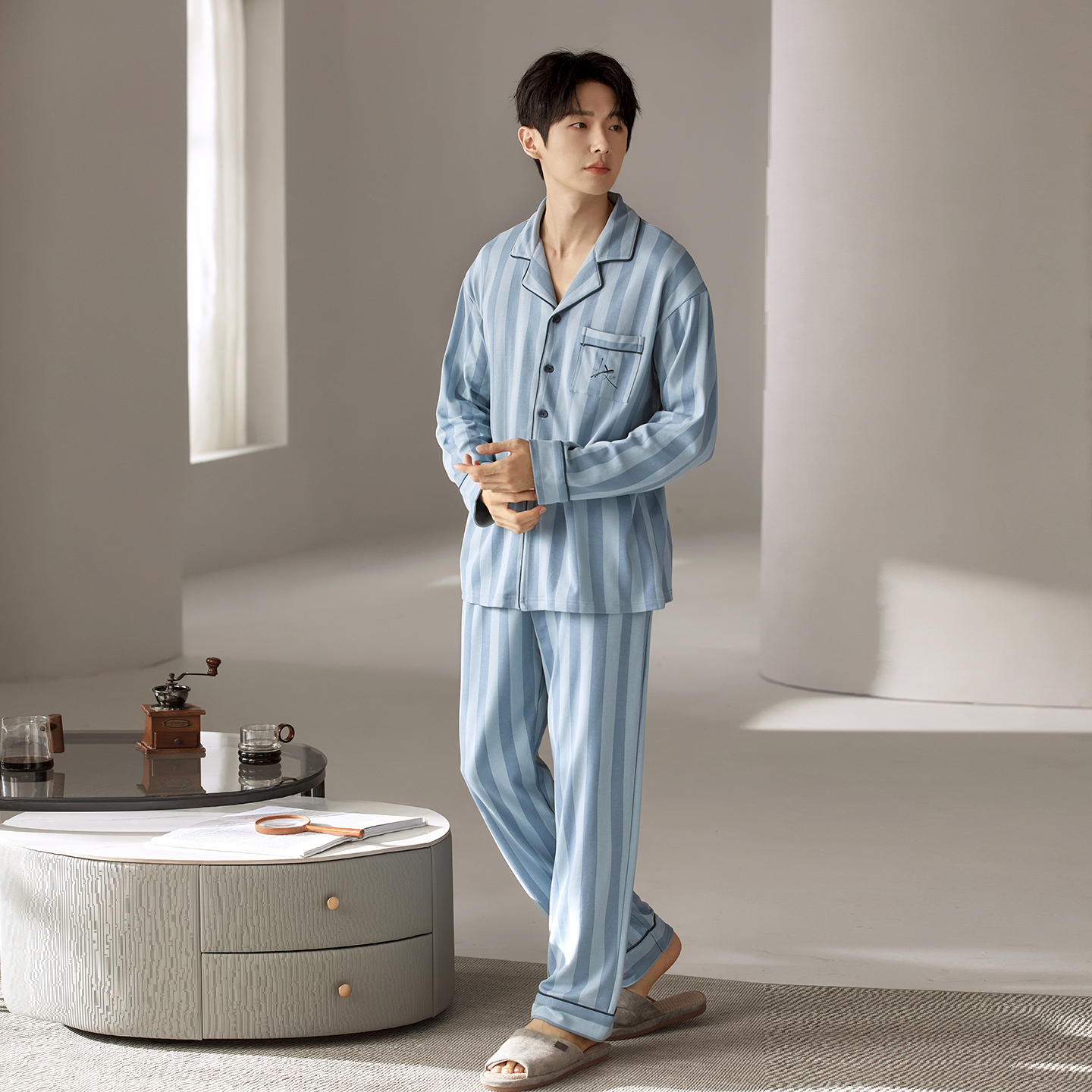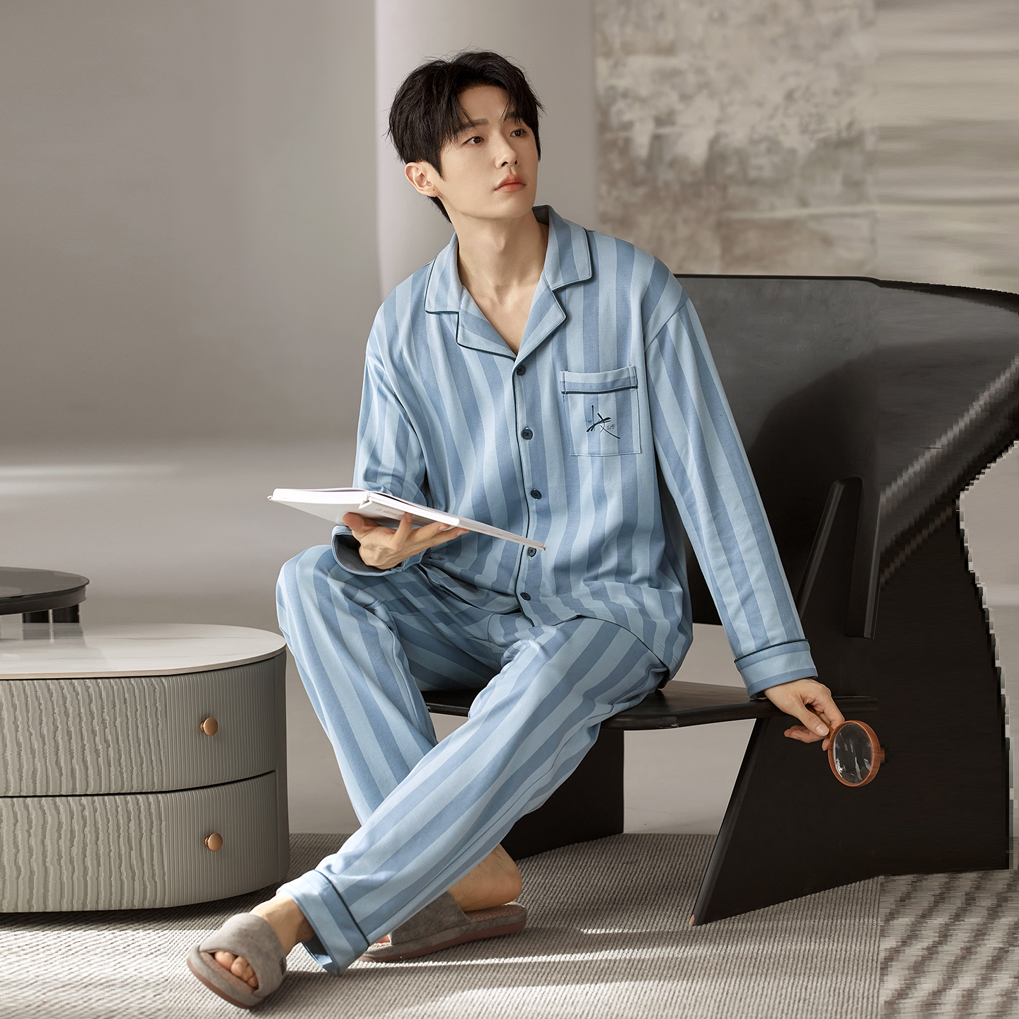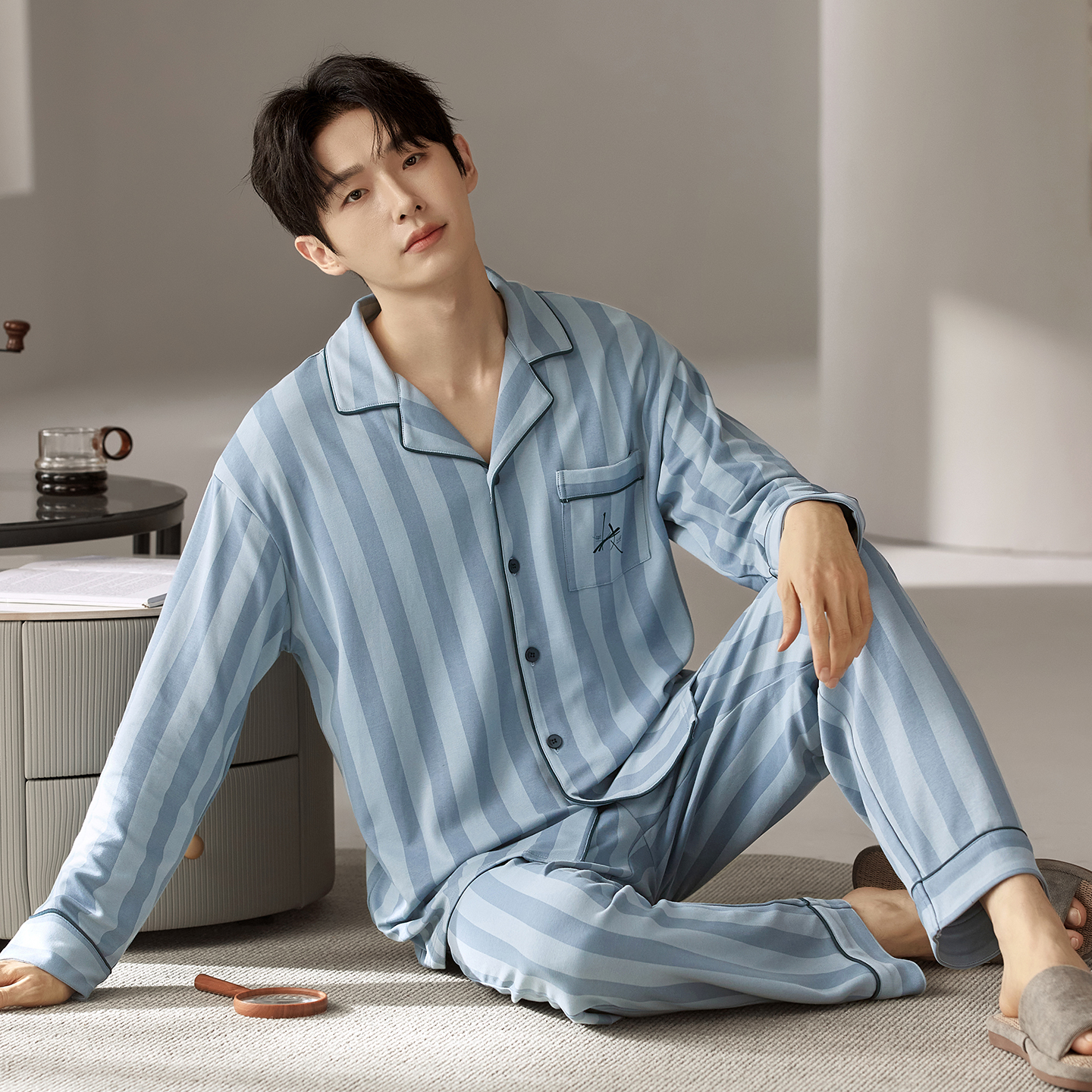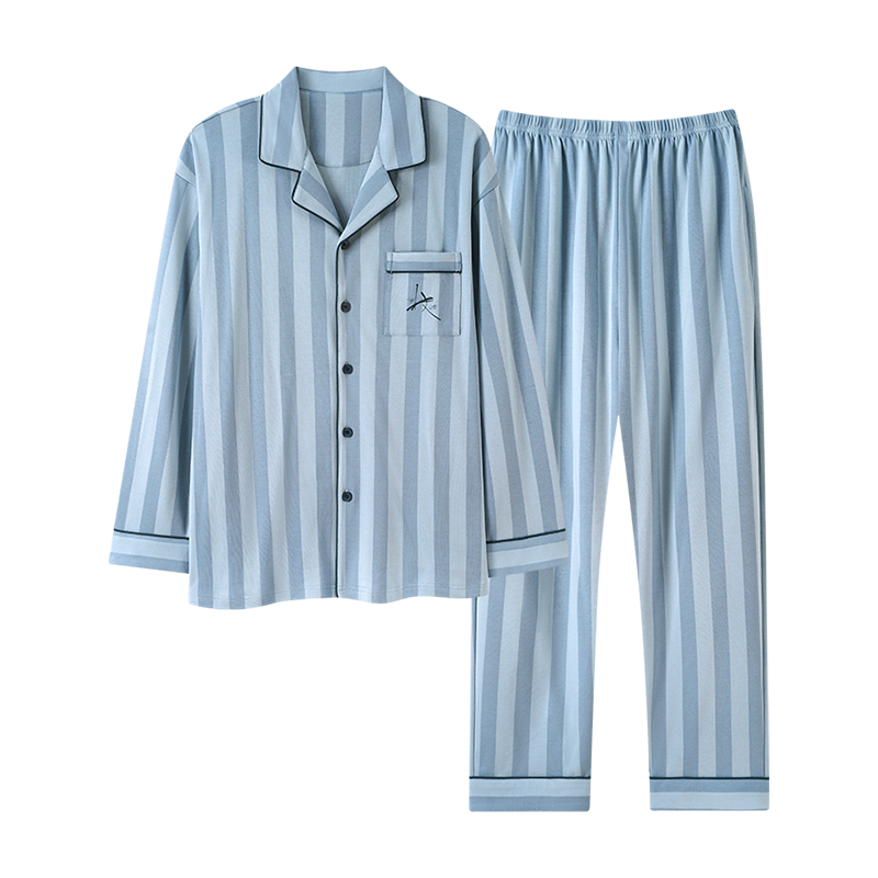 莫代尔男士纯棉翻领睡衣套装春秋季舒适透气亲肤可外穿大码家居服