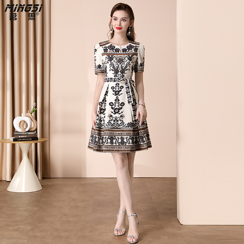 茗思民族风连衣裙女2025夏季新款定位花系带收腰小个子A字裙子