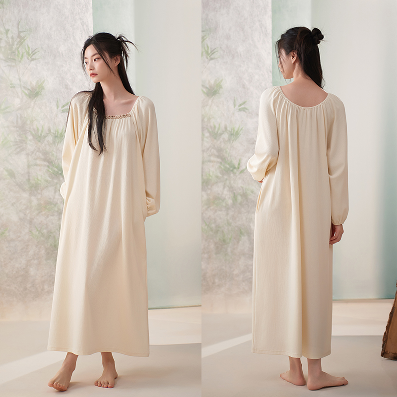 轩靓高级感睡裙女春秋季纯棉长袖2025新款睡衣简约休闲大码连衣裙