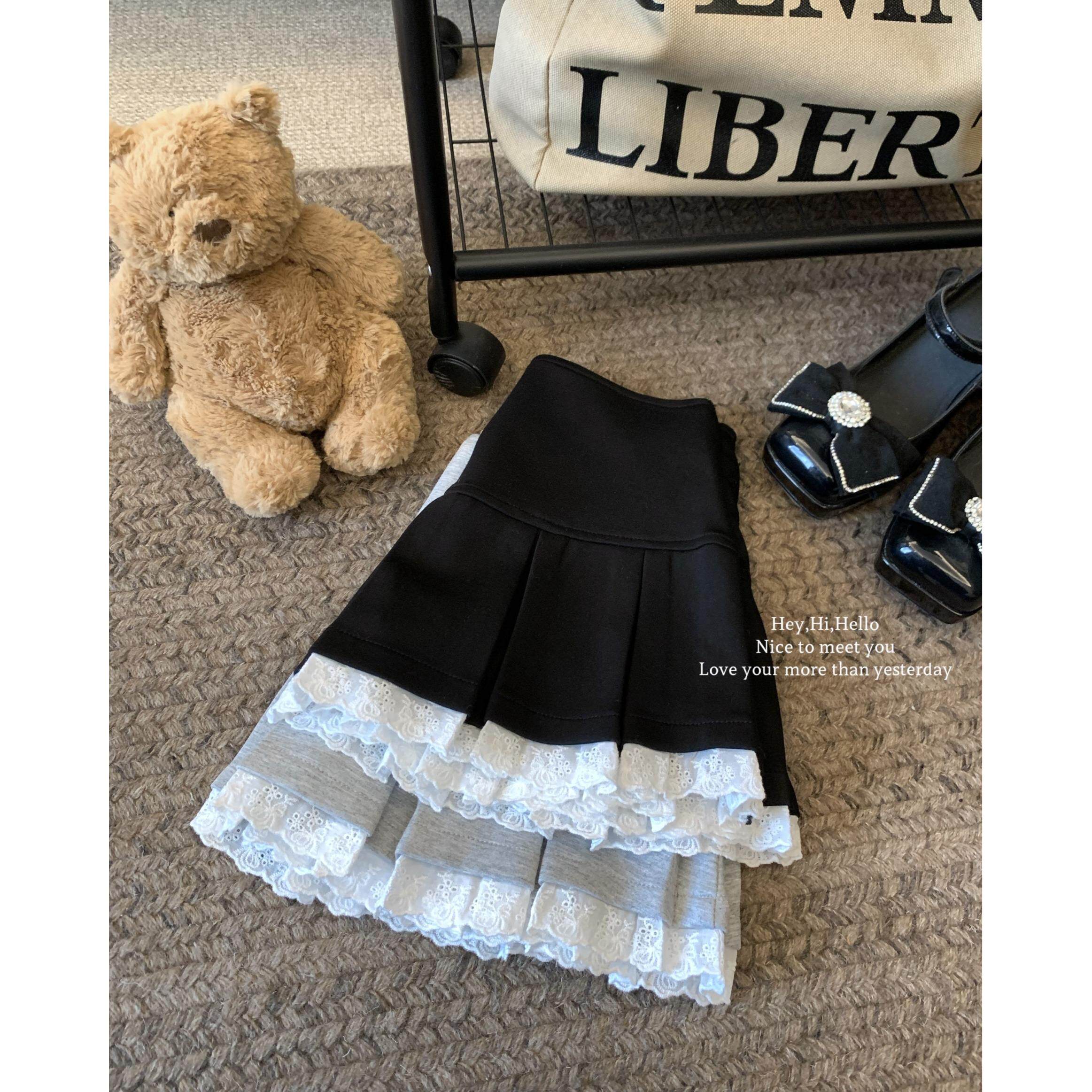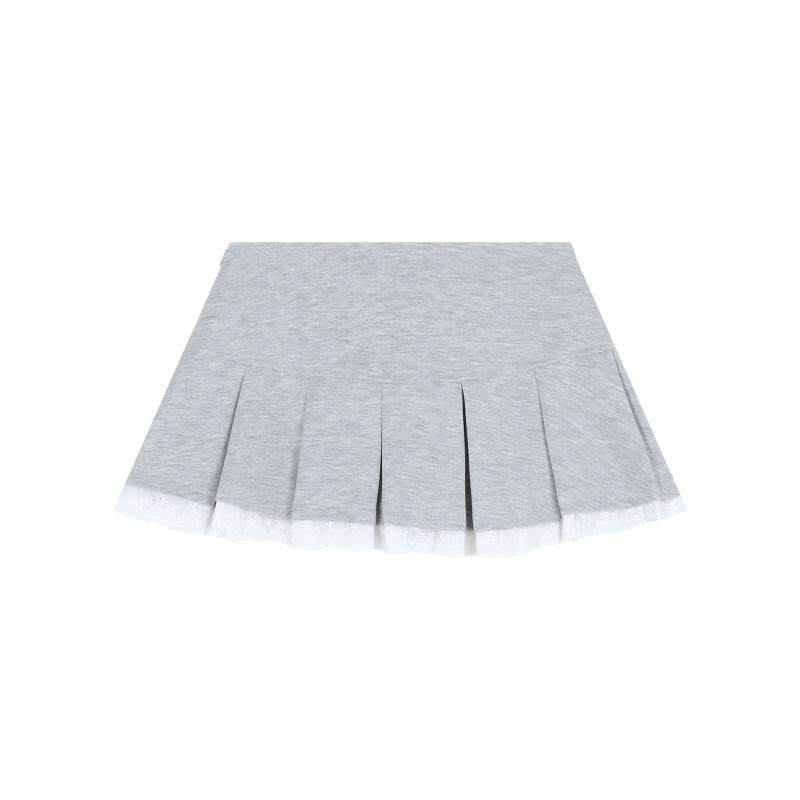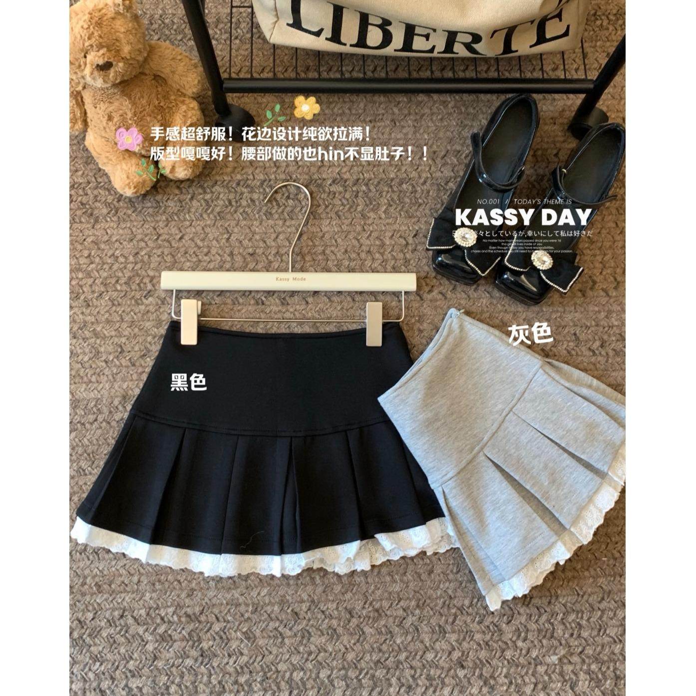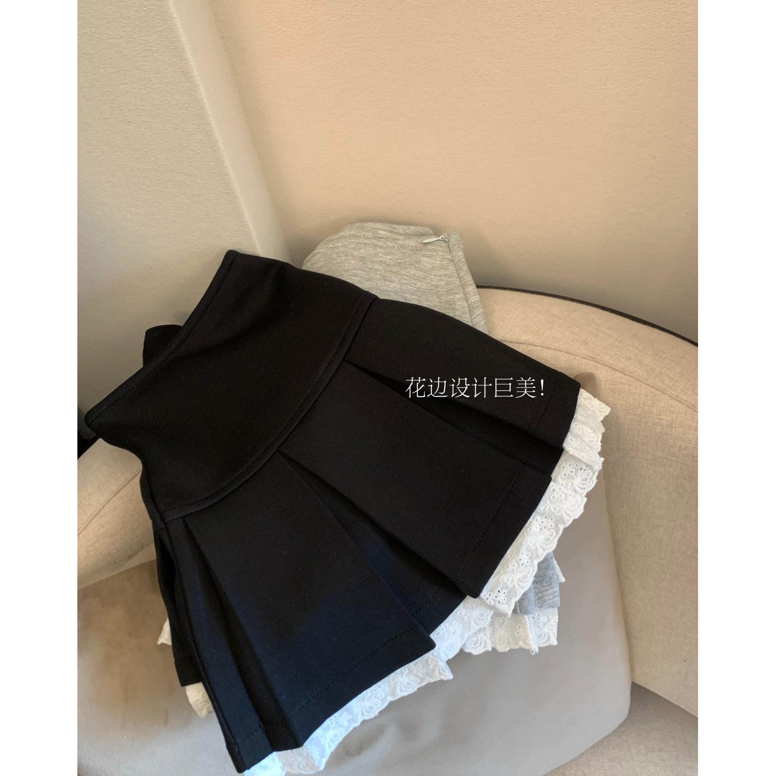 设计感蕾丝花边拼接半身裙女春季灰色百褶裙小个子防走光百搭短裙