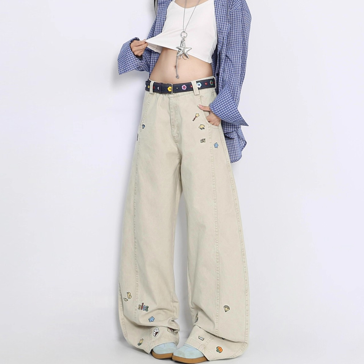300斤特大码卡通刺绣设计感牛仔裤女杏色高腰宽松显瘦阔腿长裤子