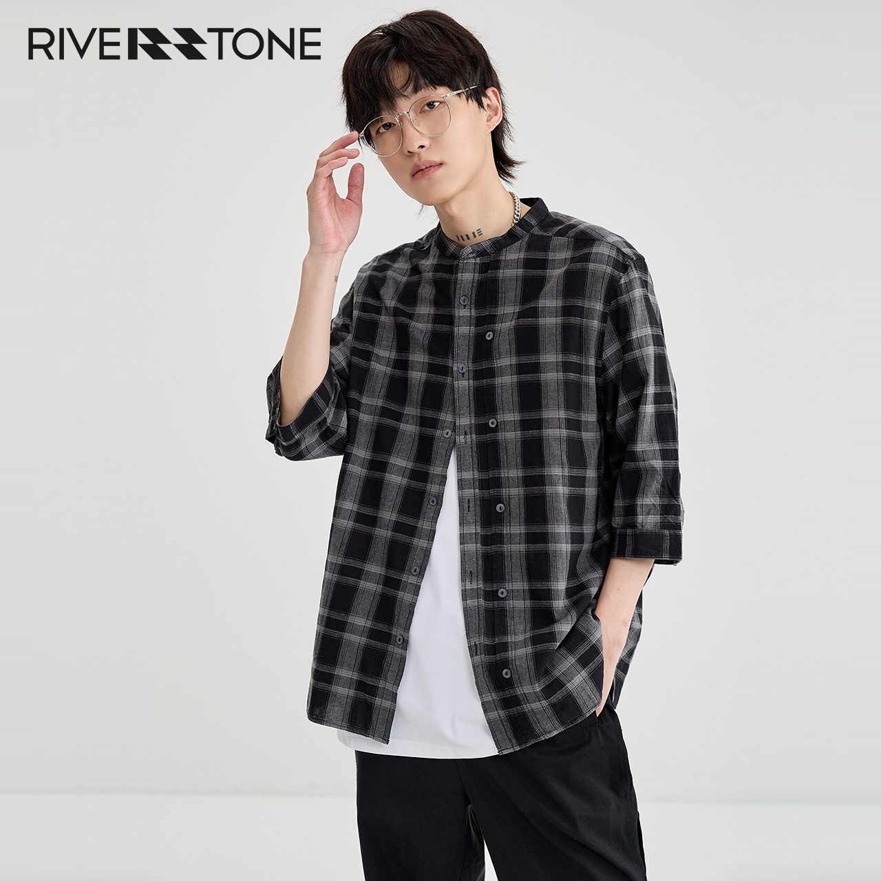 流石男装宽松中袖衬衫新款2025年夏季透气格子棉衬衫简约青年减龄