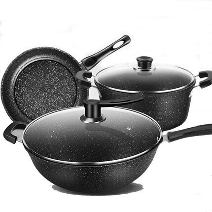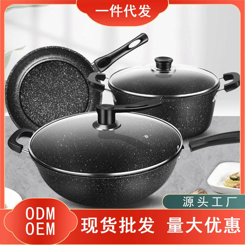 麦饭石不粘套装锅组家用汤锅煎锅三件套通用炉具加厚炒菜锅套装