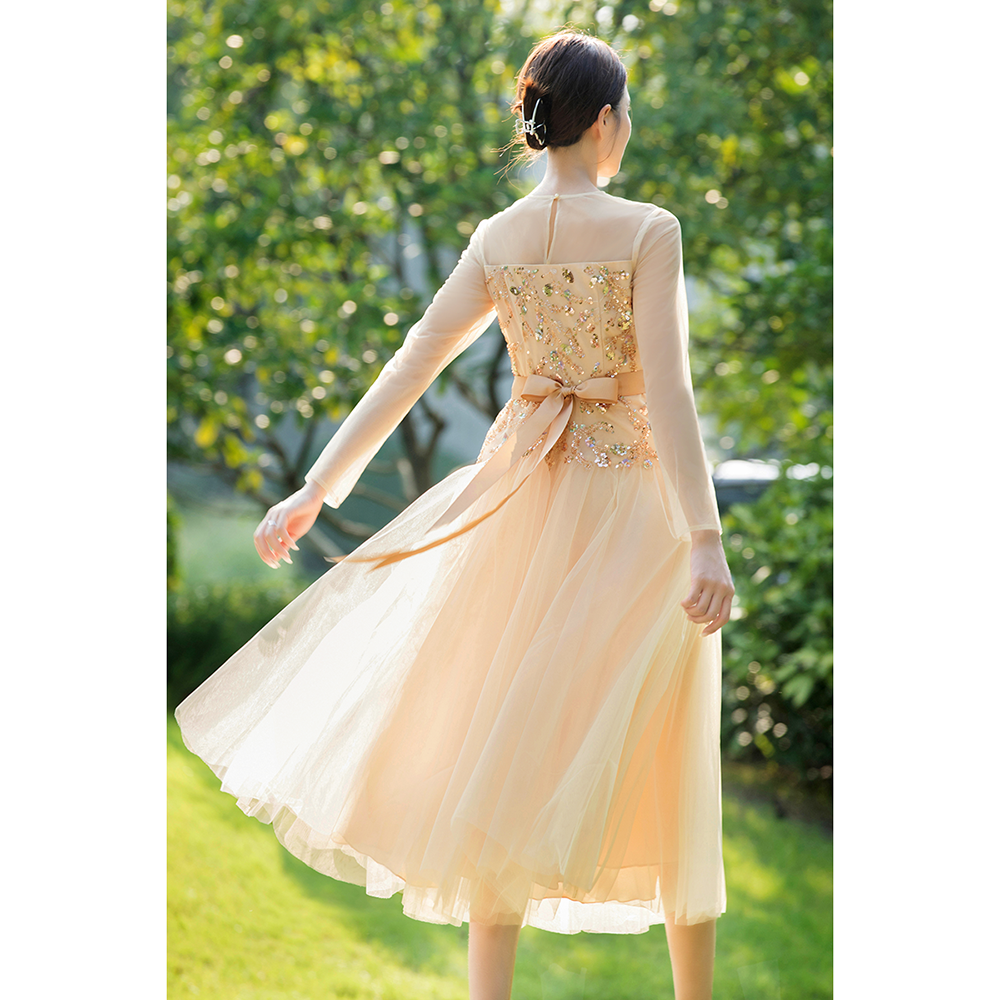 美妃黄色春秋季长袖法式收腰连衣裙2023新款女气质名媛高端小个子