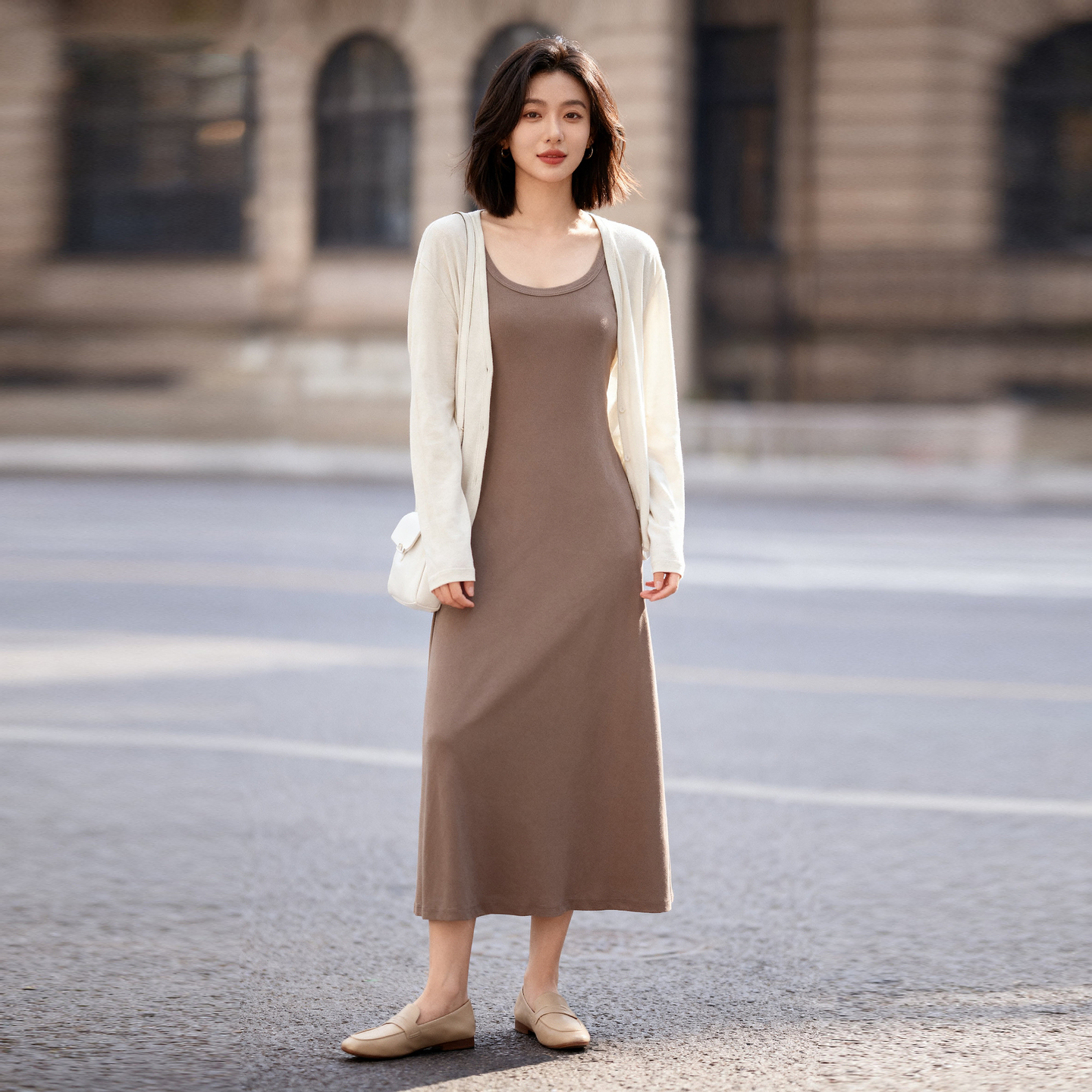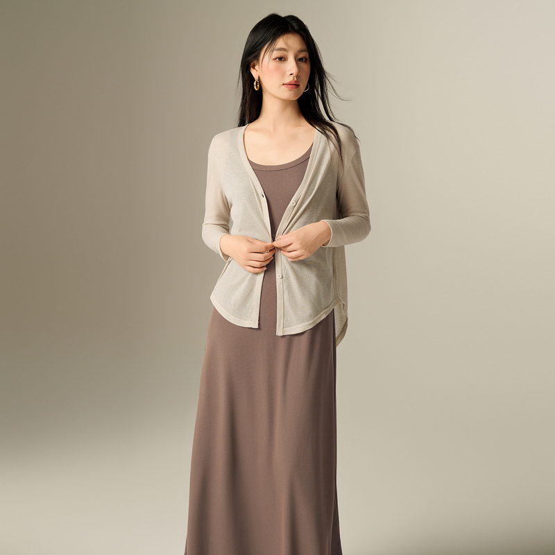 Basic House/百家好初秋新款套装纯色长袖外搭上衣吊带长裙两件套