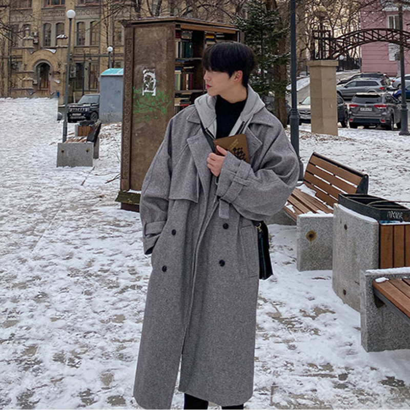 碧舍秋冬季过膝男士大衣韩版潮流宽松人字格加厚风衣双排扣呢外套