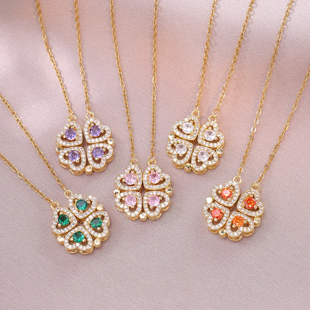 新中式项链女不掉色时尚一款两戴四叶花心连心开合爱心折叠锁骨链