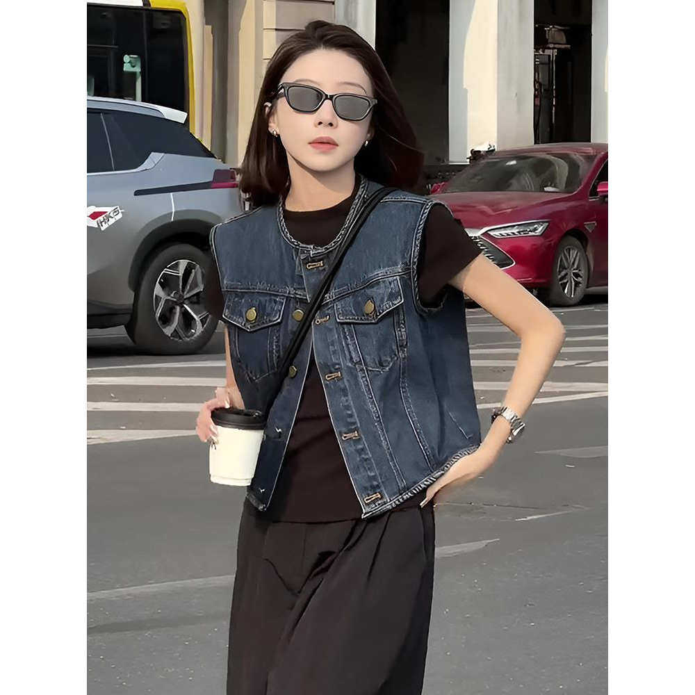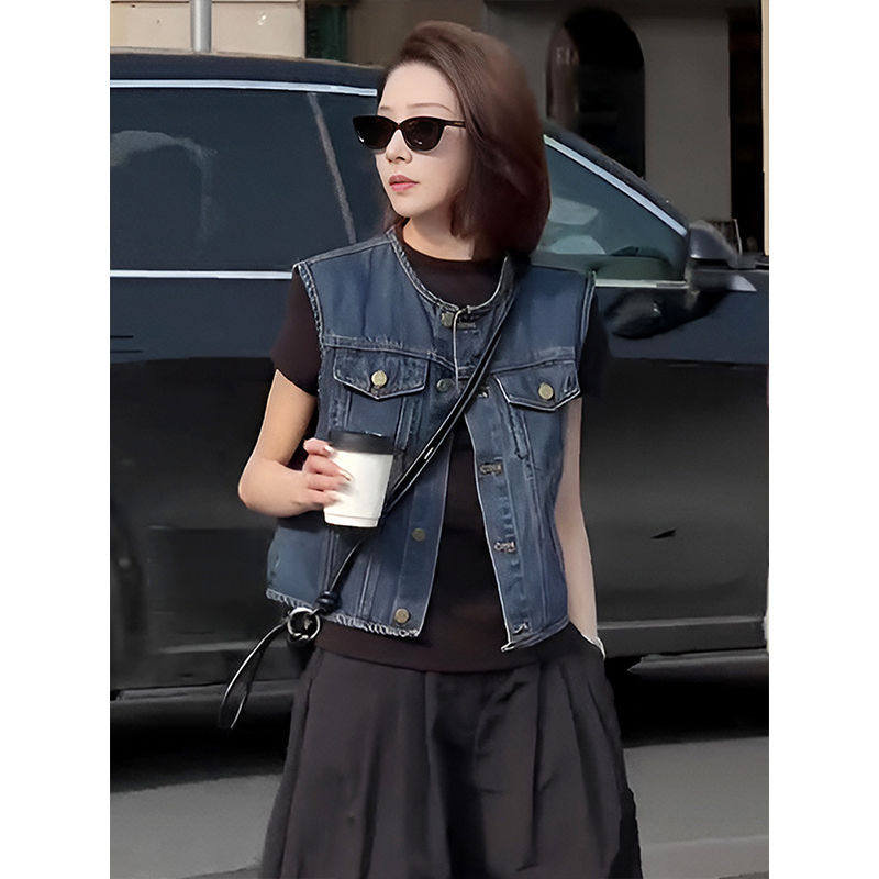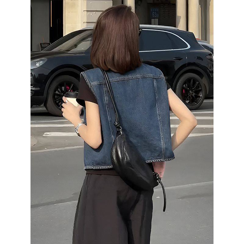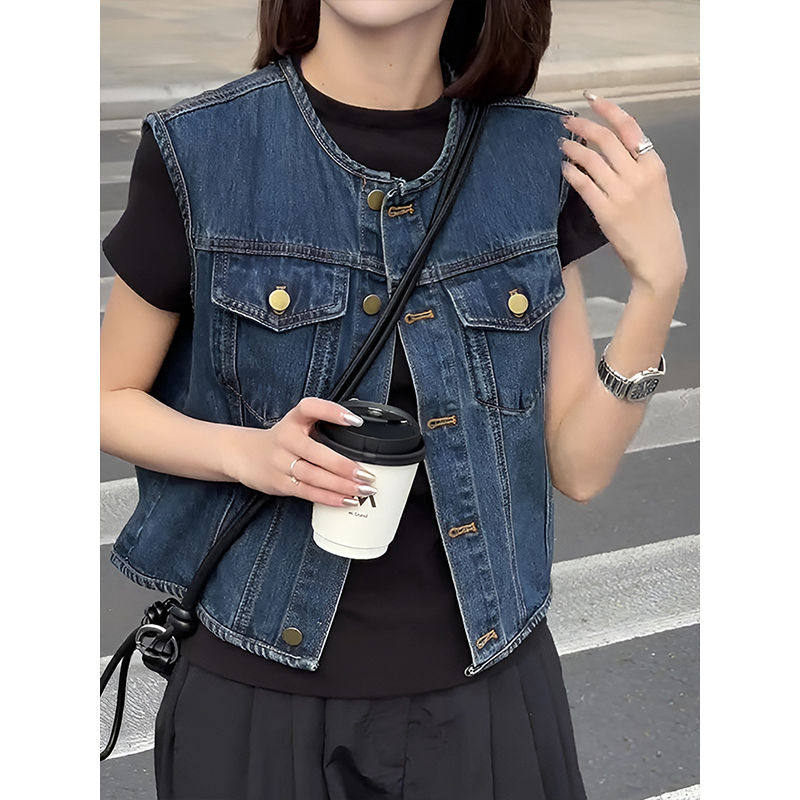 复古蓝色短款无袖背心牛仔外套女2025新款早春宽松小个子叠穿上衣