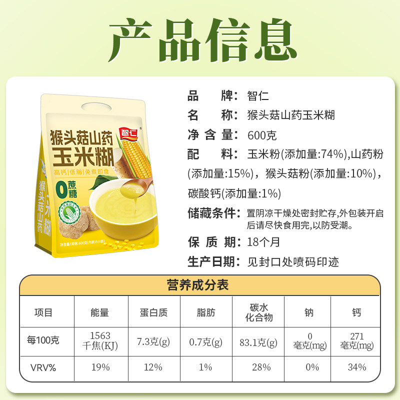 智仁无蔗糖猴头菇山药玉米糊袋装独立小包营养冲调早餐即食代餐粉