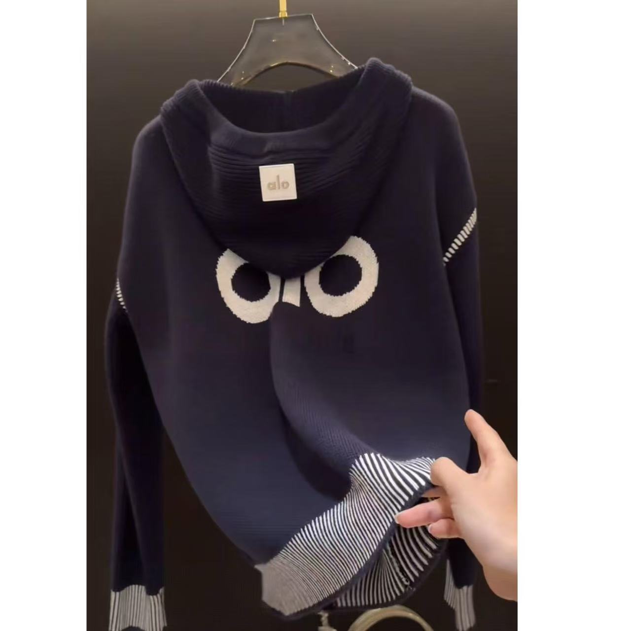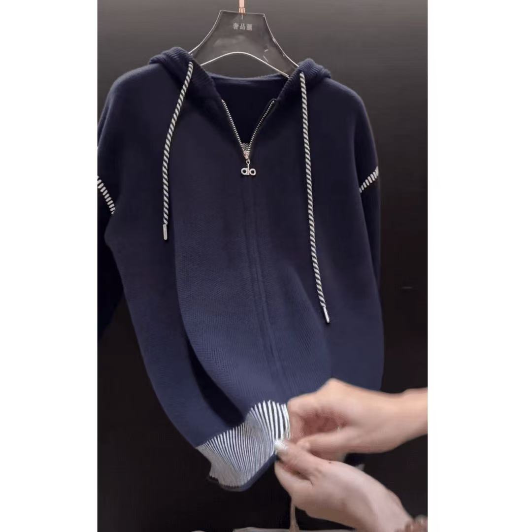 韩系早秋穿搭超好看单穿上衣美式复古藏蓝色连帽字母针织毛衣外套